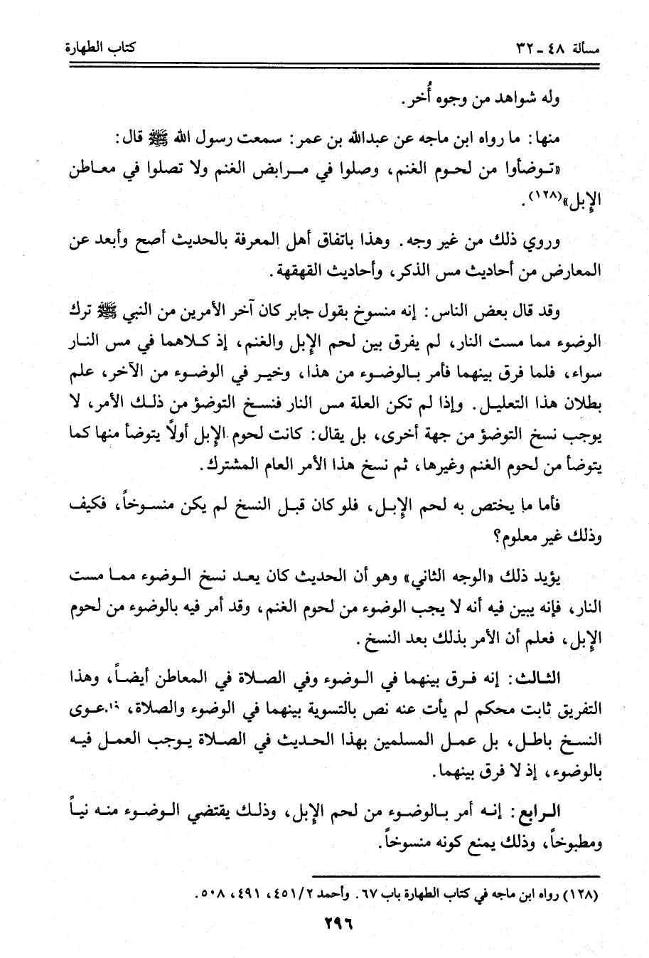 فَأَمَّا مَا يَخْتَصُّ بِهِ لَحْمُ الْإِبِلِ، فَلَوْ كَانَ قَبْلَ النَّسْخِ لَمْ يَكُنْ مَنْسُوخًا، فَكَيْفَ وَذَلِكَ غَيْرُ مَعْلُومٍ؟ يُؤَيِّدُ ذَلِكَ " الْوَجْهُ الثَّانِي " وَهُوَ أَنَّ الْحَدِيثَ كَانَ بَعْدَ نَسْخِ الْوُضُوءِ مِمَّا مَسَّتْ النَّارُ، فَإِنَّهُ يُبَيِّنُ فِيهِ أَنَّهُ لَا يَجِبُ الْوُضُوءُ مِنْ لُحُومِ الْغَنَمِ، وَقَدْ أَمَرَ فِيهِ بِالْوُضُوءِ مِنْ لُحُومِ الْإِبِلِ، فَعُلِمَ أَنَّ الْأَمْرَ بِذَلِكَ بَعْدَ النَّسْخِ. الثَّالِثُ: أَنَّهُ فَرَّقَ بَيْنَهُمَا فِي الْوُضُوءِ وَفِي الصَّلَاةِ فِي الْمَعَاطِنِ أَيْضًا، وَهَذَا التَّفْرِيقُ ثَابِتٌ مُحْكَمٌ لَمْ يَأْتِ عَنْهُ نَصٌّ بِالتَّسْوِيَةِ بَيْنَهُمَا فِي الْوُضُوءِ وَالصَّلَاةِ، فَدَعْوَى النَّسْخِ بَاطِلٌ، بَلْ عَمَلُ الْمُسْلِمِينَ بِهَذَا الْحَدِيثِ فِي الصَّلَاةِ يُوجِبُ الْعَمَلَ فِيهِ بِالْوُضُوءِ، إذْ لَا فَرْقَ بَيْنَهُمَا.