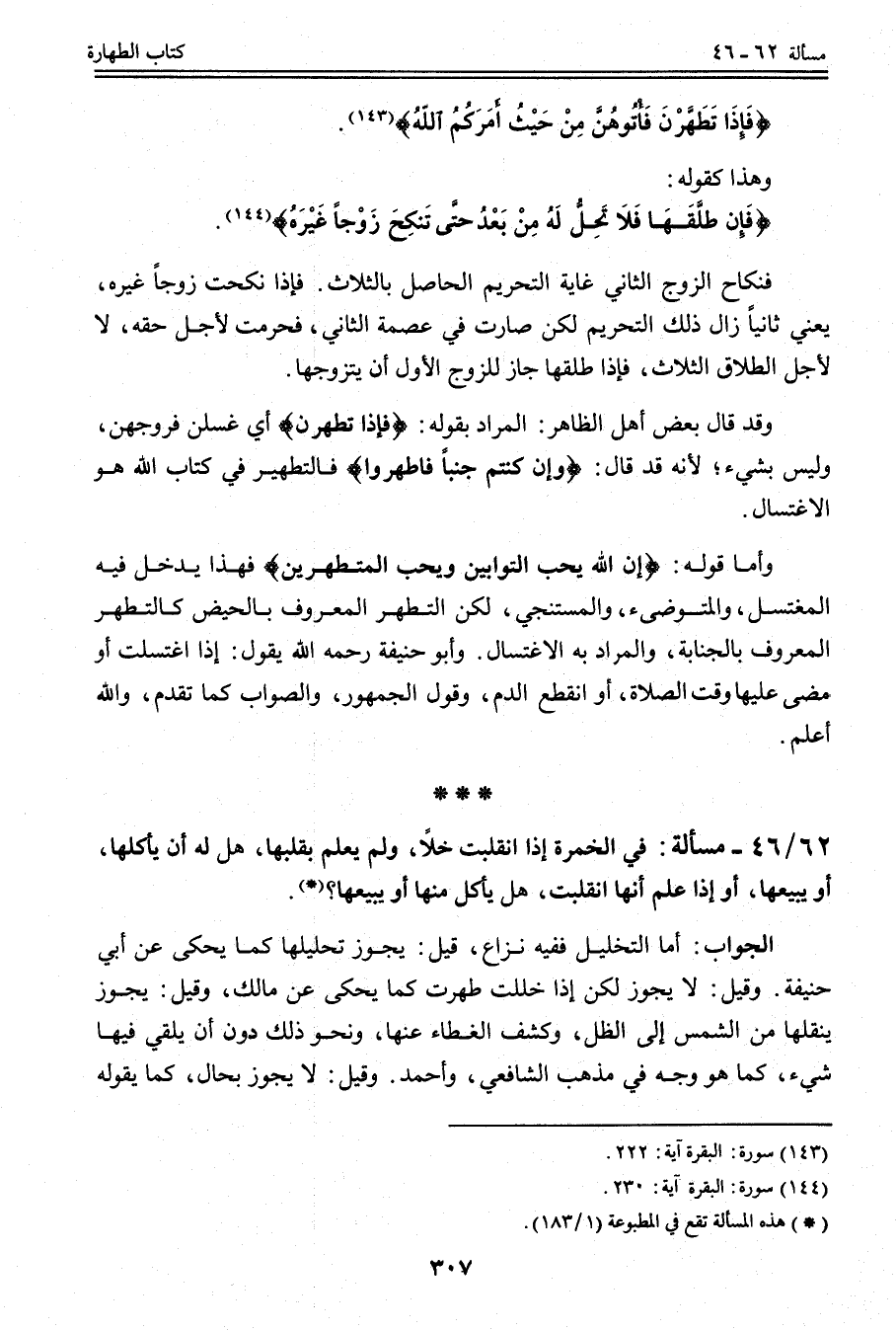 وَهَذَا كَقَوْلِهِ: {فَإِنْ طَلَّقَهَا فَلا تَحِلُّ لَهُ مِنْ بَعْدُ حَتَّى تَنْكِحَ زَوْجًا غَيْرَهُ} [البقرة: 230] . فَنِكَاحُ الزَّوْجِ الثَّانِي غَايَةُ التَّحْرِيمِ الْحَاصِلِ بِالثَّلَاثِ. فَإِذَا نَكَحَتْ زَوْجًا غَيْرَهُ، يَعْنِي ثَانِيًا زَالَ ذَلِكَ التَّحْرِيمُ لَكِنْ صَارَتْ فِي عِصْمَةِ الثَّانِي، فَحُرِّمَتْ لِأَجْلِ حَقِّهِ، لَا لِأَجْلِ الطَّلَاقِ الثَّلَاثِ، فَإِذَا طَلَّقَهَا جَازَ لِلزَّوْجِ الْأَوَّلِ أَنْ يَتَزَوَّجَهَا. وَقَدْ قَالَ بَعْضُ أَهْلِ الظَّاهِرِ: الْمُرَادُ بِقَوْلِهِ: {فَإِذَا تَطَهَّرْنَ} [البقرة: 222] أَيْ غَسَلْنَ فُرُوجَهُنَّ، وَلَيْسَ بِشَيْءٍ؛ لِأَنَّهُ قَدْ قَالَ: {وَإِنْ كُنْتُمْ جُنُبًا فَاطَّهَّرُوا} [المائدة: 6] فَالتَّطْهِيرُ فِي كِتَابِ اللَّهِ هُوَ الِاغْتِسَالُ. وَأَمَّا قَوْلُهُ: {إِنَّ اللَّهَ يُحِبُّ التَّوَّابِينَ وَيُحِبُّ الْمُتَطَهِّرِينَ} [البقرة: 222] فَهَذَا يَدْخُلُ فِيهِ الْمُغْتَسِلُ، وَالْمُتَوَضِّئُ، وَالْمُسْتَنْجِي، لَكِنْ التَّطَهُّرُ الْمَعْرُوفُ بِالْحَيْضِ كَالتَّطَهُّرِ الْمَعْرُوفِ بِالْجَنَابَةِ، وَالْمُرَادُ بِهِ الِاغْتِسَالُ. وَأَبُو حَنِيفَةَ - رَحِمَهُ اللَّهُ - يَقُولُ: إذَا اغْتَسَلَتْ أَوْ مَضَى عَلَيْهَا وَقْتُ الصَّلَاةِ، أَوْ انْقَطَعَ الدَّمُ، وَقَوْلُ الْجُمْهُورِ، وَالصَّوَابُ كَمَا تَقَدَّمَ، وَاَللَّهُ أَعْلَمُ.