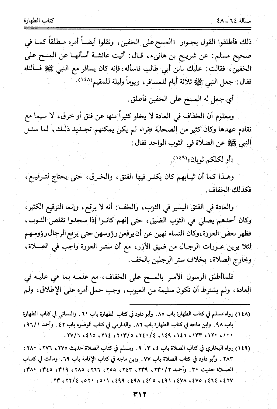 ذَلِكَ فَأَطْلَقُوا الْقَوْلَ بِجَوَازِ " الْمَسْحِ عَلَى الْخُفَّيْنِ، وَنَقَلُوا أَيْضًا أَمْرَهُ مُطْلَقًا كَمَا فِي صَحِيحِ مُسْلِمٍ: «عَنْ شُرَيْحِ بْنِ هَانِئٍ، قَالَ: أَتَيْت عَائِشَةَ أَسْأَلُهَا عَنْ الْمَسْحِ عَلَى الْخُفَّيْنِ، فَقَالَتْ: عَلَيْك بِابْنِ أَبِي طَالِبٍ فَاسْأَلْهُ، فَإِنَّهُ كَانَ يُسَافِرُ مَعَ النَّبِيِّ - صَلَّى اللَّهُ عَلَيْهِ وَسَلَّمَ - فَسَأَلْنَاهُ فَقَالَ: جَعَلَ النَّبِيُّ - صَلَّى اللَّهُ عَلَيْهِ وَسَلَّمَ - ثَلَاثَهُ أَيَّامٍ لِلْمُسَافِرِ، وَيَوْمًا وَلَيْلَةً لِلْمُقِيمِ» . أَيْ جَعَلَ لَهُ الْمَسْحَ عَلَى الْخُفَّيْنِ فَأَطْلَقَ.