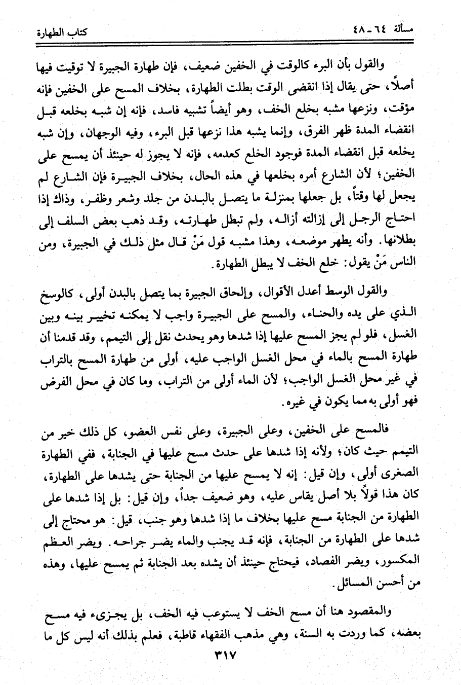 وَالْمَقْصُودُ هُنَا أَنَّ مَسْحَ الْخُفِّ لَا يُسْتَوْعَبُ فِيهِ الْخُفُّ، بَلْ يُجْزِئُ فِيهِ مَسْحُ بَعْضِهِ، كَمَا وَرَدَتْ بِهِ السُّنَّةُ، وَهِيَ مَذْهَبُ الْفُقَهَاءِ قَاطِبَةً، فَعُلِمَ بِذَلِكَ أَنَّهُ لَيْسَ كُلُّ مَا