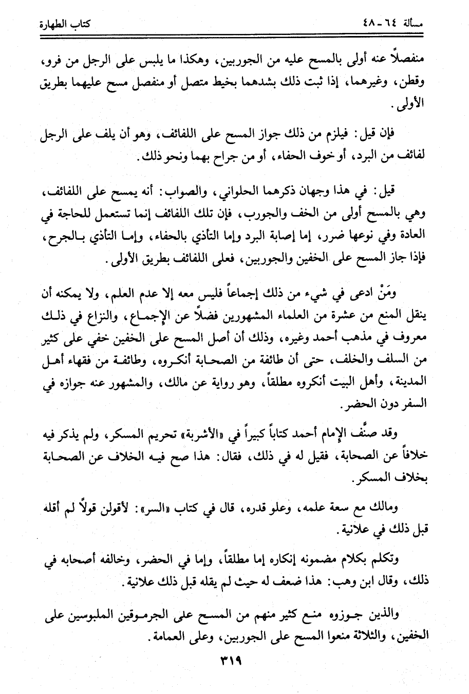 وَمَنْ ادَّعَى فِي شَيْءٍ مِنْ ذَلِكَ إجْمَاعًا فَلَيْسَ مَعَهُ إلَّا عَدَمُ الْعِلْمِ، وَلَا يُمْكِنُهُ أَنْ يَنْقُلَ الْمَنْعَ مِنْ عَشَرَةٍ مِنْ الْعُلَمَاءِ الْمَشْهُورِينَ فَضْلًا عَنْ الْإِجْمَاعِ، وَالنِّزَاعُ فِي ذَلِكَ مَعْرُوفٌ فِي مَذْهَبِ أَحْمَدَ وَغَيْرِهِ، وَذَلِكَ أَنَّ أَصْلَ الْمَسْحِ عَلَى الْخُفَّيْنِ خَفِيَ عَلَى كَثِيرٍ مِنْ السَّلَفِ وَالْخَلَفِ، حَتَّى أَنَّ طَائِفَةً مِنْ الصَّحَابَةِ أَنْكَرُوهُ، وَطَائِفَةً مِنْ فُقَهَاءِ أَهْلِ الْمَدِينَةِ، وَأَهْلُ الْبَيْتِ أَنْكَرُوهُ مُطْلَقًا، وَهُوَ رِوَايَةٌ عَنْ مَالِكٍ، وَالْمَشْهُورُ عَنْهُ جَوَازُهُ فِي السَّفَرِ دُونَ الْحَضَرِ. وَقَدْ صَنَّفَ الْإِمَامُ أَحْمَدُ كِتَابًا كَبِيرًا فِي " الْأَشْرِبَةِ " تَحْرِيمِ الْمُسْكِرِ، وَلَمْ يَذْكُرْ فِيهِ خِلَافًا عَنْ الصَّحَابَةِ، فَقِيلَ لَهُ فِي ذَلِكَ، فَقَالَ: هَذَا صَحَّ فِيهِ الْخِلَافُ عَنْ الصَّحَابَةِ بِخِلَافِ الْمُسْكِرِ. وَمَالِكٌ مَعَ سَعَةِ عِلْمِهِ، وَعُلُوِّ قَدْرِهِ.