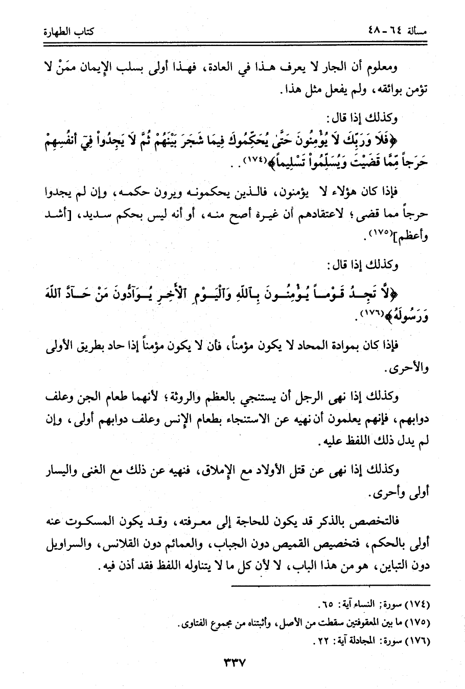 وَكَذَلِكَ إذَا قَالَ: {لا تَجِدُ قَوْمًا يُؤْمِنُونَ بِاللَّهِ وَالْيَوْمِ الآخِرِ يُوَادُّونَ مَنْ حَادَّ اللَّهَ وَرَسُولَهُ} [المجادلة: 22] . فَإِذَا كَانَ بِمُوَادَّةِ الْمُحَادِّ لَا يَكُونُ مُؤْمِنًا، فَأَنْ لَا يَكُونَ مُؤْمِنًا إذَا حَادَّ بِطَرِيقِ الْأَوْلَى وَالْأَحْرَى. وَكَذَلِكَ إذَا نُهِيَ الرَّجُلُ أَنْ يَسْتَنْجِيَ بِالْعَظْمِ وَالرَّوْثَةِ؛ لِأَنَّهُمَا طَعَامُ الْجِنِّ وَعَلَفُ دَوَابِّهِمْ، فَإِنَّهُمْ يَعْلَمُونَ أَنَّ نَهْيَهُ عَنْ الِاسْتِنْجَاءِ بِطَعَامِ الْإِنْسِ وَعَلَفِ دَوَابِّهِمْ أَوْلَى، وَإِنْ لَمْ يَدُلَّ ذَلِكَ اللَّفْظُ عَلَيْهِ. وَكَذَلِكَ إذَا نُهِيَ عَنْ قَتْلِ الْأَوْلَادِ مَعَ الْإِمْلَاقِ، فَنَهْيُهُ عَنْ ذَلِكَ مَعَ الْغِنَى وَالْيَسَارِ أَوْلَى وَأَحْرَى.
