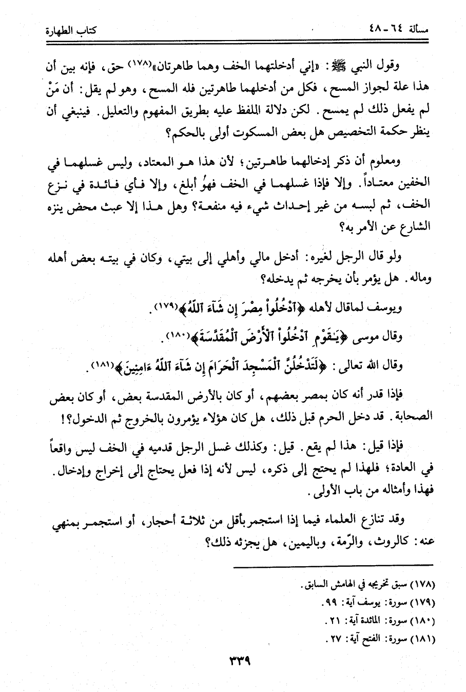 وَقَالَ مُوسَى: {يَا قَوْمِ ادْخُلُوا الأَرْضَ الْمُقَدَّسَةَ} [المائدة: 21] . وَقَالَ اللَّهُ تَعَالَى: {لَتَدْخُلُنَّ الْمَسْجِدَ الْحَرَامَ إِنْ شَاءَ اللَّهُ آمِنِينَ} [الفتح: 27] . فَإِذَا قُدِّرَ أَنَّهُ كَانَ بِمِصْرَ بَعْضُهُمْ، أَوْ كَانَ بِالْأَرْضِ الْمُقَدَّسَةِ بَعْضٌ، أَوْ كَانَ بَعْضُ الصَّحَابَةِ قَدْ دَخَلَ الْحَرَمَ قَبْلَ ذَلِكَ، هَلْ كَانَ هَؤُلَاءِ يُؤْمَرُونَ بِالْخُرُوجِ ثُمَّ الدُّخُولِ؟ فَإِذَا قِيلَ: هَذَا لَمْ يَقَعْ. قِيلَ: وَكَذَلِكَ غَسْلُ الرَّجُلِ قَدَمَيْهِ فِي الْخُفِّ لَيْسَ وَاقِعًا فِي الْعَادَةِ؛ فَلِهَذَا لَمْ يَحْتَجْ إلَى ذِكْرِهِ، لَيْسَ لِأَنَّهُ إذَا فَعَلَ يَحْتَاجُ إلَى إخْرَاجٍ وَإِدْخَالٍ. فَهَذَا وَأَمْثَالُهُ مِنْ بَابِ الْأَوْلَى.