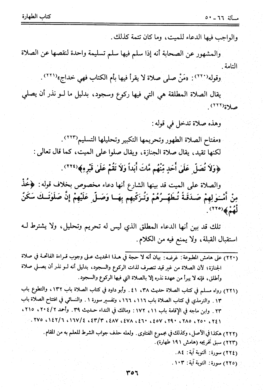 وَالْمَشْهُورُ عَنْ الصَّحَابَةِ أَنَّهُ إذَا سَلَّمَ فِيهَا سَلَّمَ تَسْلِيمَةً وَاحِدَةً لِنَقْصِهَا عَنْ الصَّلَاةِ التَّامَّةِ، وَقَوْلُهُ: «مَنْ صَلَّى صَلَاةً لَا يَقْرَأُ فِيهَا بِأُمِّ الْكِتَابِ فَهِيَ خِدَاجٌ» . يُقَالُ الصَّلَاةُ الْمُطْلَقَةُ هِيَ الَّتِي فِيهَا رُكُوعٌ وَسُجُودٌ، بِدَلِيلِ مَا لَوْ نَذَرَ أَنْ يُصَلِّيَ صَلَاةً. وَهَذِهِ صَلَاةٌ تَدْخُلُ فِي قَوْلِهِ: «مِفْتَاحُ الصَّلَاةِ الطُّهُورُ وَتَحْرِيمُهَا التَّكْبِيرُ وَتَحْلِيلُهَا التَّسْلِيمُ» . لَكِنَّهَا تُقَيَّدُ، يُقَالُ صَلَاةُ الْجِنَازَةِ، وَيُقَالُ صَلُّوا عَلَى الْمَيِّتِ، كَمَا قَالَ تَعَالَى: {وَلا تُصَلِّ عَلَى أَحَدٍ مِنْهُمْ مَاتَ أَبَدًا وَلا تَقُمْ عَلَى قَبْرِهِ} [التوبة: 84] . وَالصَّلَاةُ عَلَى الْمَيِّتِ قَدْ بَيَّنَهَا الشَّارِعُ أَنَّهَا دُعَاءٌ مَخْصُوصٌ بِخِلَافِ قَوْلِهِ: {خُذْ مِنْ أَمْوَالِهِمْ صَدَقَةً تُطَهِّرُهُمْ وَتُزَكِّيهِمْ بِهَا وَصَلِّ عَلَيْهِمْ إِنَّ صَلاتَكَ سَكَنٌ لَهُمْ} [التوبة: 103] .
