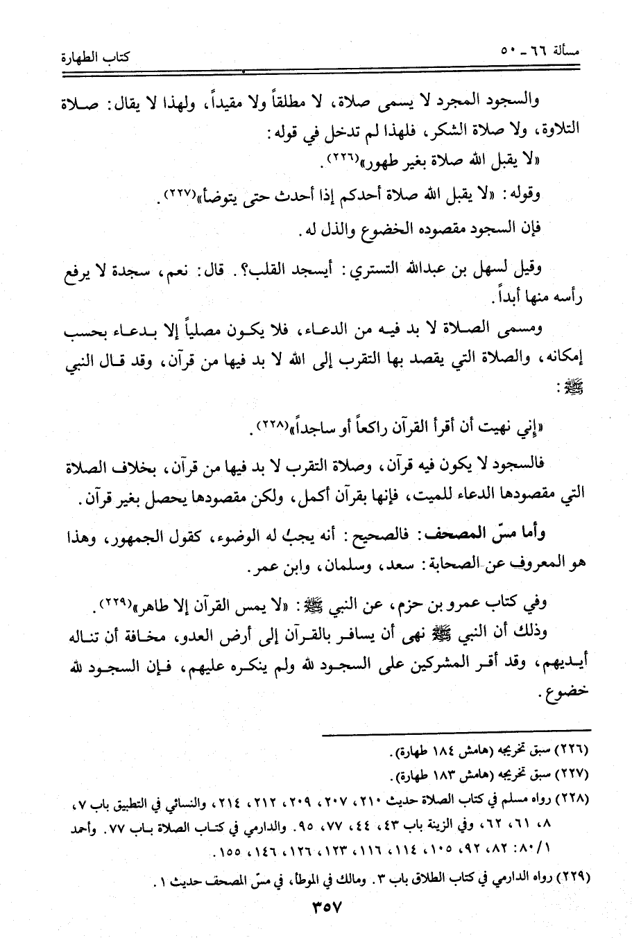 فَالسُّجُودُ لَا يَكُونُ فِيهِ قُرْآنٌ، وَصَلَاةُ التَّقَرُّبِ لَا بُدَّ فِيهَا مِنْ قُرْآنٍ، بِخِلَافِ الصَّلَاةِ الَّتِي مَقْصُودُهَا الدُّعَاءُ لِلْمَيِّتِ، فَإِنَّهَا بِقُرْآنٍ أَكْمَلَ، وَلَكِنْ مَقْصُودُهَا يَحْصُلُ بِغَيْرِ قُرْآنٍ، وَأَمَّا مَسُّ الْمُصْحَفِ: فَالصَّحِيحُ: أَنَّهُ يَجِبُ لَهُ الْوُضُوءُ، كَقَوْلِ الْجُمْهُورِ، وَهَذَا هُوَ الْمَعْرُوفُ عَنْ الصَّحَابَةِ: سَعْدٍ، وَسَلْمَانَ، وَابْنِ عُمَرَ، وَفِي كِتَابِ عَمْرِو بْنِ حَزْمٍ، عَنْ النَّبِيِّ - صَلَّى اللَّهُ عَلَيْهِ وَسَلَّمَ -: «لَا يَمَسُّ الْقُرْآنَ إلَّا طَاهِرٌ» .