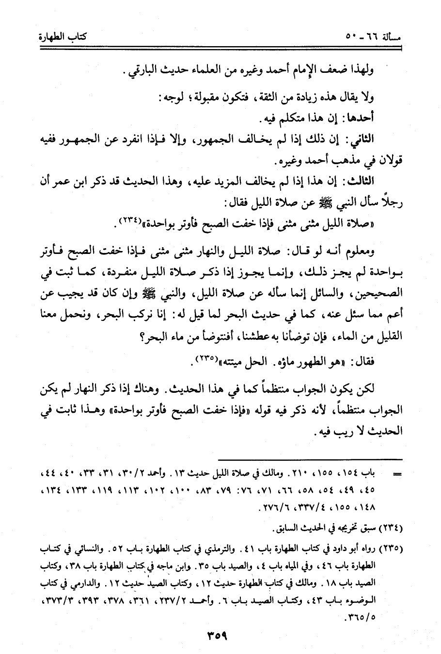 الثَّالِثُ: أَنَّ هَذَا إذَا لَمْ يُخَالِفْ الْمَزِيدَ عَلَيْهِ، وَهَذَا الْحَدِيثُ قَدْ ذَكَرَ ابْنُ عُمَرَ «أَنَّ رَجُلًا سَأَلَ النَّبِيَّ - صَلَّى اللَّهُ عَلَيْهِ وَسَلَّمَ - عَنْ صَلَاةِ اللَّيْلِ فَقَالَ: صَلَاةُ اللَّيْلِ مَثْنَى مَثْنَى فَإِذَا خِفْتَ الصُّبْحَ فَأَوْتِرْ بِوَاحِدَةٍ» . وَمَعْلُومٌ أَنَّهُ لَوْ قَالَ: صَلَاةُ اللَّيْلِ وَالنَّهَارِ مَثْنَى مَثْنَى. فَإِذَا خِفْت الصُّبْحَ فَأَوْتِرْ بِوَاحِدَةٍ لَمْ يَجُزْ ذَلِكَ، وَإِنَّمَا يَجُوزُ إذَا ذَكَرَ صَلَاةَ اللَّيْلِ مُنْفَرِدَةً، كَمَا ثَبَتَ فِي الصَّحِيحَيْنِ، وَالسَّائِلُ إنَّمَا سَأَلَهُ عَنْ صَلَاةِ اللَّيْلِ، وَالنَّبِيُّ - صَلَّى اللَّهُ عَلَيْهِ وَسَلَّمَ - وَإِنْ كَانَ قَدْ يُجِيبُ عَنْ أَعَمَّ مِمَّا سُئِلَ عَنْهُ، كَمَا فِي حَدِيثِ الْبَحْرِ «لَمَّا قِيلَ لَهُ: إنَّا نَرْكَبُ الْبَحْرَ، وَنَحْمِلُ مَعَنَا الْقَلِيلَ مِنْ الْمَاءِ، فَإِنْ تَوَضَّأْنَا بِهِ عَطِشْنَا، أَفَنَتَوَضَّأُ مِنْ مَاءِ الْبَحْرِ؟ فَقَالَ: هُوَ الطَّهُورُ مَاؤُهُ الْحِلُّ مَيْتَتُهُ» .