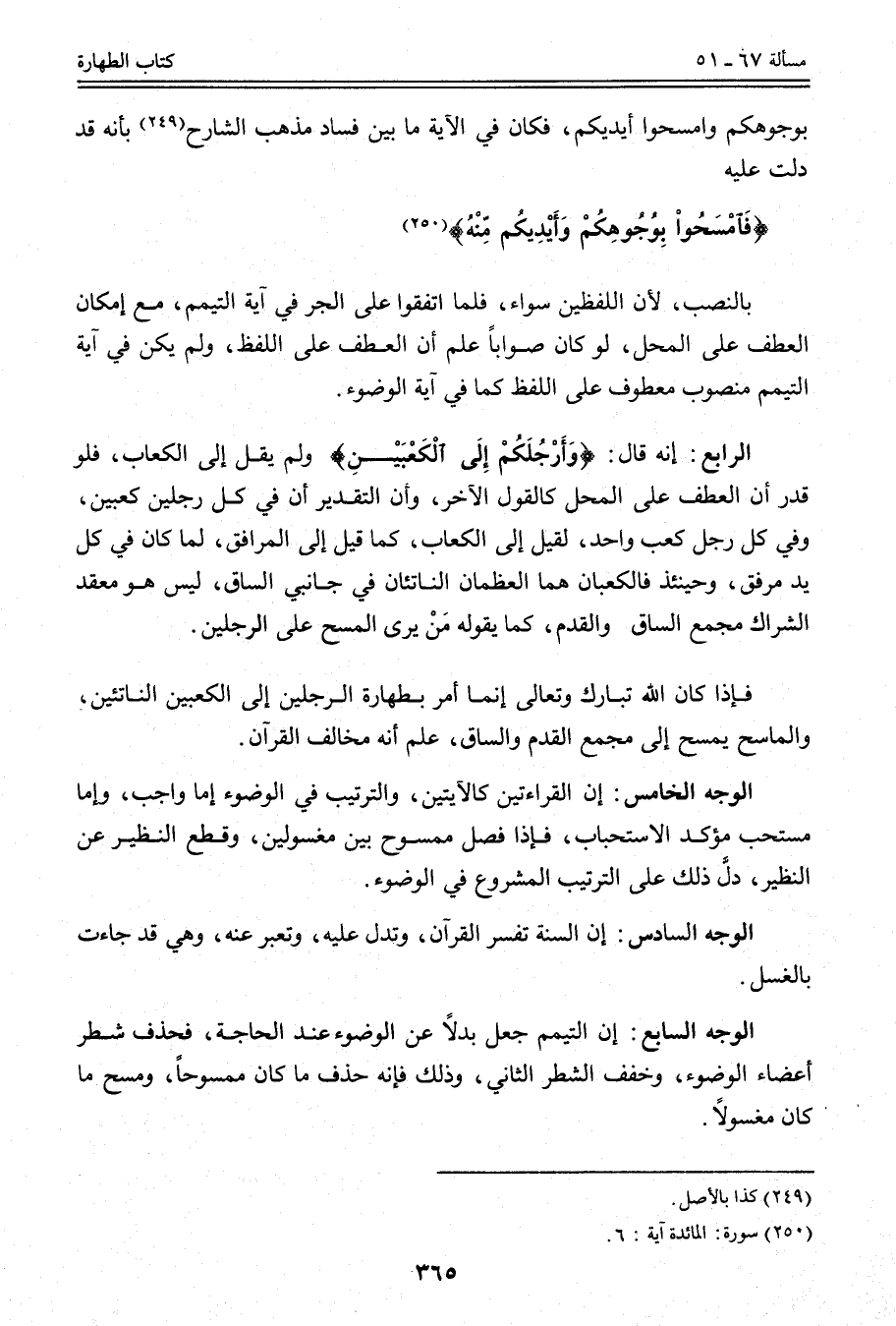 الْوَجْهُ الْخَامِسُ: أَنَّ الْقِرَاءَتَيْنِ كَالْآيَتَيْنِ، وَالتَّرْتِيبُ فِي الْوُضُوءِ إمَّا وَاجِبٌ، وَإِمَّا مُسْتَحَبٌّ مُؤَكَّدُ الِاسْتِحْبَابِ، فَإِذَا فُصِلَ مَمْسُوحٌ بَيْنَ مَغْسُولَيْنِ، وَقُطِعَ النَّظِيرُ عَنْ النَّظِيرِ، دَلَّ ذَلِكَ عَلَى التَّرْتِيبِ الْمَشْرُوعِ فِي الْوُضُوءِ. الْوَجْهُ السَّادِسُ: أَنَّ السُّنَّةَ تُفَسِّرُ الْقُرْآنَ، وَتَدُلُّ عَلَيْهِ، وَتُعَبِّرُ عَنْهُ، وَهِيَ قَدْ جَاءَتْ بِالْغَسْلِ. الْوَجْهُ السَّابِعُ: أَنَّ التَّيَمُّمَ جُعِلَ بَدَلًا عَنْ الْوُضُوءِ عِنْدَ الْحَاجَةِ، فَحُذِفَ شَطْرُ أَعْضَاءِ الْوُضُوءِ، وَخُفِّفَ الشَّطْرُ الثَّانِي، وَذَلِكَ فَإِنَّهُ حُذِفَ مَا كَانَ مَمْسُوحًا، وَمُسِحَ مَا كَانَ مَغْسُولًا.
