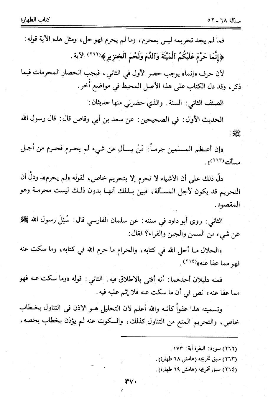 الصِّنْفُ الثَّانِي: السُّنَّةُ، وَاَلَّذِي حَضَرَنِي مِنْهَا حَدِيثَانِ: الْحَدِيثُ الْأَوَّلُ: فِي الصَّحِيحَيْنِ: عَنْ سَعْدِ بْنِ أَبِي وَقَّاصٍ قَالَ: قَالَ رَسُولُ اللَّهِ - صَلَّى اللَّهُ عَلَيْهِ وَسَلَّمَ -: «إنَّ أَعْظَمَ الْمُسْلِمِينَ جُرْمًا: مَنْ يَسْأَلُ عَنْ شَيْءٍ لَمْ يُحَرَّمْ فَحُرِّمَ مِنْ أَجْلِ مَسْأَلَتِهِ» . دَلَّ ذَلِكَ عَلَى أَنَّ الْأَشْيَاءَ لَا تُحَرَّمُ إلَّا بِتَحْرِيمٍ خَاصٍّ، لِقَوْلِهِ " لَمْ يُحَرَّمْ " وَدَلَّ أَنَّ التَّحْرِيمَ قَدْ يَكُونُ لِأَجْلِ الْمَسْأَلَةِ، فَبَيَّنَ بِذَلِكَ أَنَّهَا بِدُونِ ذَلِكَ لَيْسَتْ مُحَرَّمَةً وَهُوَ الْمَقْصُودُ. الثَّانِي: رَوَى أَبُو دَاوُد فِي سُنَنِهِ: عَنْ سَلْمَانَ الْفَارِسِيِّ قَالَ: سُئِلَ رَسُولُ اللَّهِ - صَلَّى اللَّهُ عَلَيْهِ وَسَلَّمَ - عَنْ شَيْءٍ مِنْ السَّمْنِ وَالْجُبْنِ وَالْفِرَاءِ؟ فَقَالَ: «الْحَلَالُ مَا أَحَلَّ اللَّهُ فِي كِتَابِهِ، وَالْحَرَامُ مَا حَرَّمَ اللَّهُ فِي كِتَابِهِ، وَمَا سَكَتَ عَنْهُ فَهُوَ مِمَّا عَفَا عَنْهُ» .