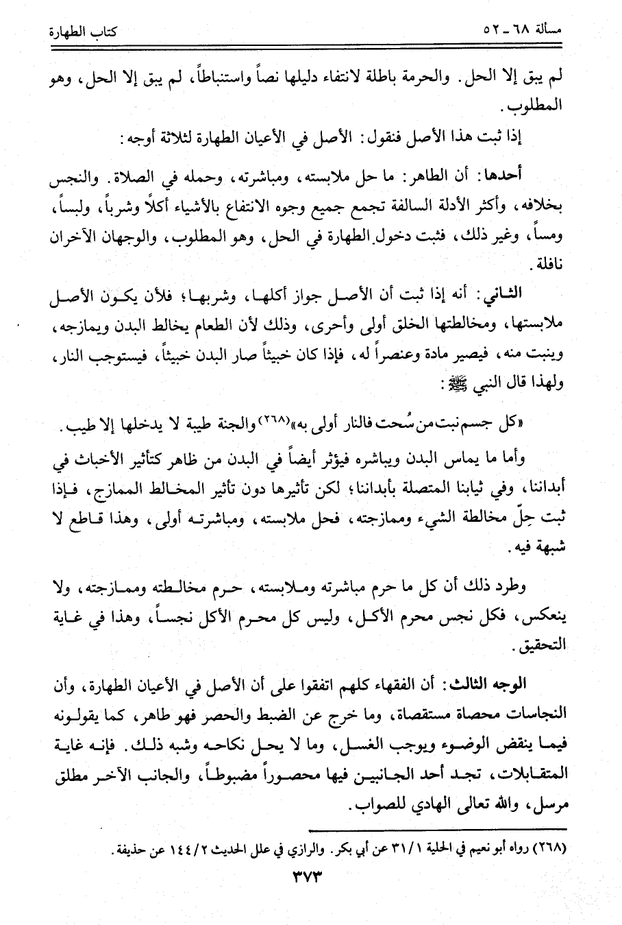 لَمْ يَبْقَ إلَّا الْحِلُّ. وَالْحُرْمَةُ بَاطِلَةٌ لِانْتِفَاءِ دَلِيلِهَا نَصًّا وَاسْتِنْبَاطًا لَمْ يَبْقَ إلَّا الْحِلُّ، وَهُوَ الْمَطْلُوبُ. إذَا ثَبَتَ هَذَا الْأَصْلُ فَنَقُولُ: الْأَصْلُ فِي الْأَعْيَانِ الطَّهَارَةُ لِثَلَاثَةِ أَوْجُهٍ. أَحَدُهَا: أَنَّ الطَّاهِرَ: مَا حَلَّ مُلَابَسَتُهُ، وَمُبَاشَرَتُهُ، وَحَمْلُهُ فِي الصَّلَاةِ. وَالنَّجِسُ بِخِلَافِهِ، وَأَكْثَرُ الْأَدِلَّةِ السَّالِفَةِ تَجْمَعُ جَمِيعَ وُجُوهِ الِانْتِفَاعِ بِالْأَشْيَاءِ أَكْلًا وَشُرْبًا، وَلُبْسًا، وَمَسًّا، وَغَيْرَ ذَلِكَ، فَثَبَتَ دُخُولُ الطَّهَارَةِ فِي الْحِلِّ، وَهُوَ الْمَطْلُوبُ، وَالْوَجْهَانِ الْآخَرَانِ نَافِلَةٌ.