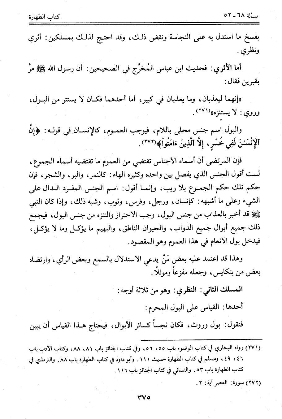 أَمَّا الْأَثَرِيُّ: فَحَدِيثُ ابْنِ عَبَّاسٍ الْمُخَرَّجُ فِي الصَّحِيحَيْنِ: «أَنَّ رَسُولَ اللَّهِ - صَلَّى اللَّهُ عَلَيْهِ وَسَلَّمَ - مَرَّ بِقَبْرَيْنِ فَقَالَ: إنَّهُمَا لَيُعَذَّبَانِ، وَمَا يُعَذَّبَانِ فِي كَبِيرٍ، أَمَّا أَحَدُهُمَا فَكَانَ لَا يَسْتَتِرُ مِنْ الْبَوْلِ، وَرُوِيَ: لَا يَسْتَنْزِهُ» . وَالْبَوْلُ اسْمُ جِنْسٍ مُحَلَّى بِاللَّامِ، فَيُوجِبُ الْعُمُومَ، كَالْإِنْسَانِ فِي قَوْلِهِ: {إِنَّ الإِنْسَانَ لَفِي خُسْرٍ - إِلا الَّذِينَ آمَنُوا} [العصر: 2 - 3] .