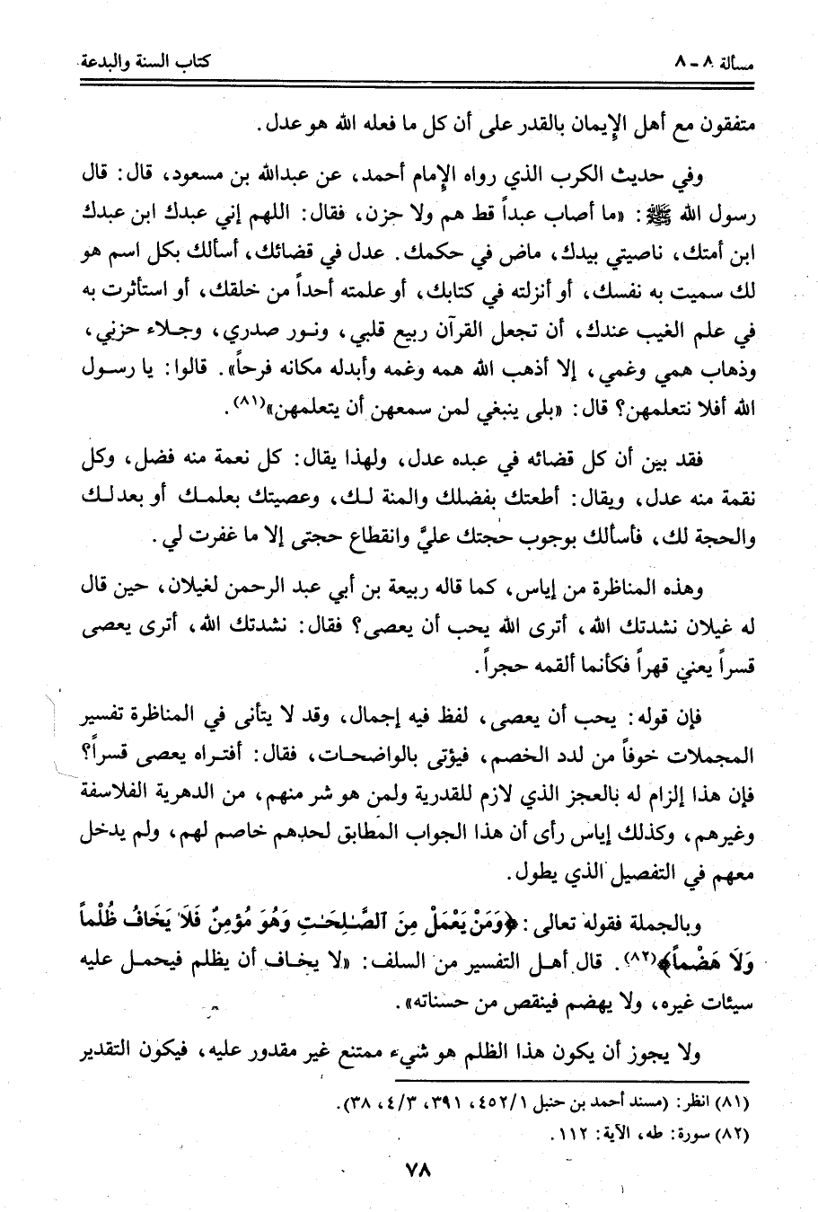فَقَدْ بَيَّنَ أَنَّ كُلَّ قَضَائِهِ فِي عَبْدِهِ عَدْلٌ، وَلِهَذَا يُقَالُ: كُلُّ نِعْمَةٍ مِنْهُ فَضْلٌ، وَكُلُّ نِقْمَةٍ مِنْهُ عَدْلٌ، وَيُقَالُ: أَطَعْتُك بِفَضْلِك وَالْمِنَّةُ لَك، وَعَصَيْتُك بِعِلْمِك أَوْ بِعَدْلِك وَالْحُجَّةُ لَك، فَأَسْأَلُك بِوُجُوبِ حُجَّتِك عَلَيَّ وَانْقِطَاعِ حُجَّتِي إلَّا مَا غَفَرْت لِي. وَهَذِهِ الْمُنَاظَرَةُ مِنْ إيَاسٍ، كَمَا قَالَهُ رَبِيعَةُ بْنُ أَبِي عَبْدِ الرَّحْمَنِ لِغَيْلَانَ، حِينَ قَالَ لَهُ غَيْلَانُ نَشَدْتُك اللَّهَ، أَتَرَى اللَّهَ يُحِبُّ أَنْ يُعْصَى؟ فَقَالَ: نَشَدْتُك اللَّهَ، أَتَرَى يُعْصَى قَسْرًا يَعْنِي قَهْرًا فَكَأَنَّمَا أَلْقَمَهُ حَجَرًا. فَإِنَّ قَوْلَهُ: يُحِبُّ أَنْ يُعْصَى، لَفْظٌ فِيهِ إجْمَالٌ، وَقَدْ لَا يَتَأَتَّى فِي الْمُنَاظَرَةِ تَفْسِيرُ الْمُجْمَلَاتِ خَوْفًا مِنْ لَدَدِ الْخَصْمِ، فَيُؤْتَى بِالْوَاضِحَاتِ، فَقَالَ: أَفَتَرَاهُ يُعْصَى قَسْرًا؟ فَإِنَّ هَذَا إلْزَامٌ لَهُ بِالْعَجْزِ الَّذِي لَازِمٌ لِلْقَدَرِيَّةِ وَلِمَنْ هُوَ شَرٌّ مِنْهُمْ، مِنْ الدَّهْرِيَّةِ الْفَلَاسِفَةِ وَغَيْرِهِمْ، وَكَذَلِكَ إيَاسٌ رَأَى أَنَّ هَذَا الْجَوَابَ الْمُطَابِقَ لِحَدِّهِمْ خَاصِمٌ لَهُمْ، وَلَمْ يَدْخُلْ مَعَهُمْ فِي التَّفْصِيلِ الَّذِي يَطُولُ. وَبِالْجُمْلَةِ فَقَوْلُهُ - تَعَالَى -: {وَمَنْ يَعْمَلْ مِنَ الصَّالِحَاتِ وَهُوَ مُؤْمِنٌ فَلا يَخَافُ ظُلْمًا وَلا هَضْمًا} [طه: 112] .