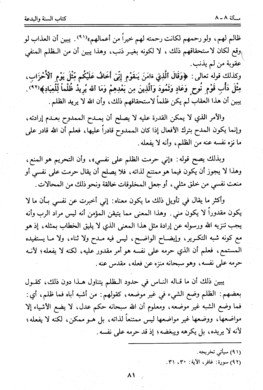 يُبَيِّنُ أَنَّ هَذَا الْعِقَابَ لَمْ يَكُنْ ظُلْمًا لِاسْتِحْقَاقِهِمْ ذَلِكَ، وَأَنَّ اللَّهَ لَا يُرِيدُ الظُّلْمَ. وَالْأَمْرُ الَّذِي لَا يُمْكِنُ الْقُدْرَةُ عَلَيْهِ لَا يَصْلُحُ أَنْ يُمْدَحَ الْمَمْدُوحُ بِعَدَمِ إرَادَتِهِ، وَإِنَّمَا يَكُونُ الْمَدْحُ بِتَرْكِ الْأَفْعَالِ إذَا كَانَ الْمَمْدُوحُ قَادِرًا عَلَيْهَا، فَعُلِمَ أَنَّ اللَّهَ قَادِرٌ عَلَى مَا نَزَّهَ نَفْسَهُ عَنْهُ مِنْ الظُّلْمِ، وَأَنَّهُ لَا يَفْعَلُهُ. وَبِذَلِكَ يَصِحُّ قَوْلُهُ: «إنِّي حَرَّمْت الظُّلْمَ عَلَى نَفْسِي» ، وَأَنَّ التَّحْرِيمَ هُوَ الْمَنْعُ، وَهَذَا لَا يَجُوزُ أَنْ يَكُونَ فِيمَا هُوَ مُمْتَنِعٌ لِذَاتِهِ، فَلَا يَصْلُحُ أَنْ يُقَالَ حَرَّمْت عَلَى نَفْسِي أَوْ مَنَعْت نَفْسِي مِنْ خَلْقِ مِثْلِي، أَوْ جَعَلَ الْمَخْلُوقَاتِ خَالِقَةً وَنَحْوُ ذَلِكَ مِنْ الْمُحَالَاتِ.