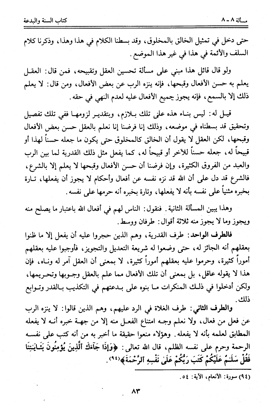 وَالطَّرَفُ الثَّانِي: طَرَفُ الْغُلَاةِ فِي الرَّدِّ عَلَيْهِمْ، وَهُمْ الَّذِينَ قَالُوا: لَا يُنَزَّهُ الرَّبُّ عَنْ فِعْلٍ مِنْ فِعَالٍ، وَلَا نَعْلَمُ وَجْهَ امْتِنَاعِ الْفِعْلِ مِنْهُ إلَّا مِنْ جِهَةِ خَبَرِهِ أَنَّهُ لَا يَفْعَلُهُ الْمُطَابِقُ لِعِلْمِهِ بِأَنَّهُ لَا يَفْعَلُهُ، وَهَؤُلَاءِ مَنَعُوا حَقِيقَةَ مَا أَخْبَرَ بِهِ مِنْ أَنَّهُ كَتَبَ عَلَى نَفْسِهِ الرَّحْمَةَ وَحَرَّمَ عَلَى نَفْسِهِ الظُّلْمَ، قَالَ اللَّهُ - تَعَالَى -: {وَإِذَا جَاءَكَ الَّذِينَ يُؤْمِنُونَ بِآيَاتِنَا فَقُلْ سَلامٌ عَلَيْكُمْ كَتَبَ رَبُّكُمْ عَلَى نَفْسِهِ الرَّحْمَةَ} [الأنعام: 54] .