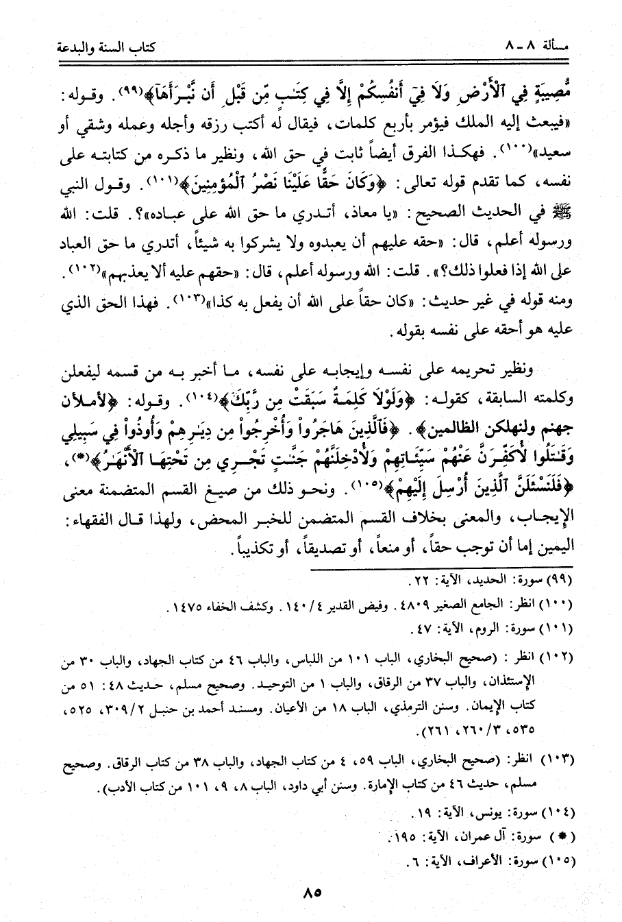 وَقَوْلُهُ: «فَيُبْعَثُ إلَيْهِ الْمَلَكُ فَيُؤْمَرُ بِأَرْبَعِ كَلِمَاتٍ، فَيُقَالُ لَهُ اُكْتُبْ رِزْقَهُ وَأَجَلَهُ وَعَمَلَهُ وَشَقِيٌّ أَوْ سَعِيدٌ» . فَهَذَا الْفَرْقُ أَيْضًا ثَابِتٌ فِي حَقِّ اللَّهِ، وَنَظِيرُ مَا ذَكَرَهُ مِنْ كِتَابَتِهِ عَلَى نَفْسِهِ، كَمَا تَقَدَّمَ قَوْله تَعَالَى {وَكَانَ حَقًّا عَلَيْنَا نَصْرُ الْمُؤْمِنِينَ} [الروم: 47] . وَقَوْلُ النَّبِيِّ - صَلَّى اللَّهُ عَلَيْهِ وَسَلَّمَ - فِي الْحَدِيثِ الصَّحِيحِ: «يَا مُعَاذُ، أَتَدْرِي مَا حَقُّ اللَّهِ عَلَى عِبَادِهِ؟ قُلْت: اللَّهُ وَرَسُولُهُ أَعْلَمُ، قَالَ: حَقُّهُ عَلَيْهِمْ أَنْ يَعْبُدُوهُ وَلَا يُشْرِكُوا بِهِ شَيْئًا، أَتَدْرِي مَا حَقُّ الْعِبَادِ عَلَى اللَّهِ إذَا فَعَلُوا ذَلِكَ. قُلْت: اللَّهُ وَرَسُولُهُ أَعْلَمُ، قَالَ: حَقُّهُمْ عَلَيْهِ أَلَّا يُعَذِّبَهُمْ» ، وَمِنْهُ قَوْلُهُ فِي غَيْرِ حَدِيثٍ: " كَانَ حَقًّا عَلَى اللَّهِ أَنْ يَفْعَلَ بِهِ كَذَا ". فَهَذَا الْحَقُّ الَّذِي عَلَيْهِ هُوَ أَحَقُّهُ عَلَى نَفْسِهِ بِقَوْلِهِ.