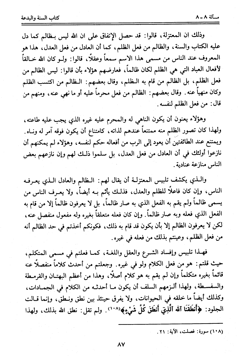 وَيَمْتَنِعُ عِنْدَ الطَّائِفَتَيْنِ أَنْ يَعُودَ إلَى الرَّبِّ مِنْ أَفْعَالِهِ حُكْمٌ لِنَفْسِهِ وَهَؤُلَاءِ لَمْ يُمْكِنْهُمْ أَنْ نَازَعُوا أُولَئِكَ فِي أَنَّ الْعَادِلَ مَنْ فَعَلَ الْعَدْلَ، بَلْ سَلَّمُوا ذَلِكَ لَهُمْ وَإِنْ نَازَعَهُمْ بَعْضُ النَّاسِ مُنَازَعَةً عِنَادِيَّةً. وَاَلَّذِي يَكْشِفُ تَلْبِيسَ الْمُعْتَزِلَةِ أَنْ يُقَالَ لَهُمْ: الظَّالِمُ وَالْعَادِلُ الَّذِي يَعْرِفُهُ النَّاسُ، وَإِنْ كَانَ فَاعِلًا لِلظُّلْمِ وَالْعَدْلِ، فَذَلِكَ يَأْثَمُ بِهِ أَيْضًا، وَلَا يَعْرِفُ النَّاسُ مَنْ يُسَمَّى ظَالِمًا وَلَمْ يَقُمْ بِهِ الْفِعْلُ الَّذِي صَارَ ظَالِمًا، بَلْ لَا يَعْرِفُونَ ظَالِمًا إلَّا مَنْ قَامَ بِهِ الْفِعْلُ الَّذِي فَعَلَهُ وَبِهِ صَارَ ظَالِمًا، وَإِنْ كَانَ فِعْلُهُ مُتَعَلِّقًا بِغَيْرِهِ وَلَهُ مَفْعُولٌ مُنْفَصِلٌ عَنْهُ، لَكِنْ لَا يَعْرِفُونَ الظَّالِمَ إلَّا بِأَنْ يَكُونَ قَدْ قَامَ بِهِ ذَلِكَ، فَكَوْنُكُمْ أَخَذْتُمْ فِي حَدِّ الظَّالِمِ أَنَّهُ مَنْ فَعَلَ الظُّلْمَ، وَعَيَّنْتُمْ بِذَلِكَ مَنْ فَعَلَهُ فِي غَيْرِهِ فَهَذَا تَلْبِيسٌ وَإِفْسَادُ الشَّرْعِ وَالْعَقْلِ وَاللُّغَةِ، كَمَا فَعَلْتُمْ فِي مُسَمَّى الْمُتَكَلِّمِ، حَيْثُ قُلْتُمْ: هُوَ مِنْ فِعْلِ الْكَلَامِ وَلَوْ فِي غَيْرِهِ، وَجَعَلْتُمْ مَنْ أَحْدَثَ كَلَامًا مُنْفَصِلًا عَنْهُ قَائِمًا بِغَيْرِهِ مُتَكَلِّمًا وَإِنْ لَمْ يَقُمْ بِهِ هُوَ كَلَامٌ أَصْلًا، وَهَذَا مِنْ أَعْظَمِ الْبُهْتَانِ وَالْقَرْمَطَةِ وَالسَّفْسَطَةِ، وَلِهَذَا أَلْزَمَهُمْ السَّلَفُ أَنْ يَكُونَ مَا أَحْدَثَهُ مِنْ الْكَلَامِ فِي الْجَمَادَاتِ، وَكَذَلِكَ أَيْضًا مَا خَلَقَهُ فِي الْحَيَوَانَاتِ، وَلَا يُفَرَّقُ حِينَئِذٍ بَيْنَ نُطْقٍ وَنُطْقٍ، وَإِنَّمَا قَالَتْ الْجُلُودُ: {أَنْطَقَنَا اللَّهُ الَّذِي أَنْطَقَ كُلَّ شَيْءٍ} [فصلت: 21] ، وَلَمْ تَقُلْ: نَطَقَ اللَّهُ بِذَلِكَ.