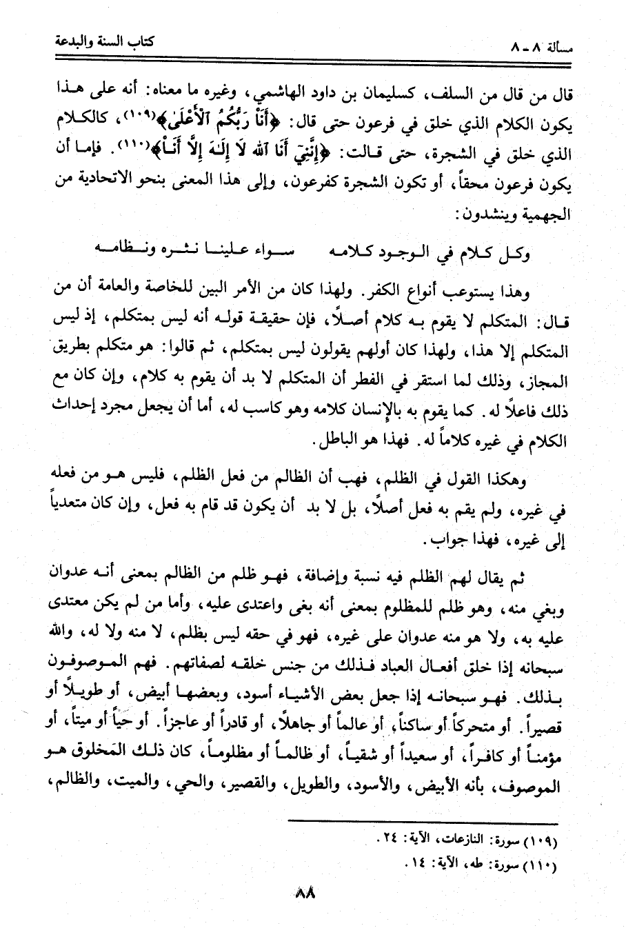 قَالَ مَنْ قَالَ مِنْ السَّلَفِ، كَسُلَيْمَانَ بْنِ دَاوُد الْهَاشِمِيِّ، وَغَيْرِهِ مَا مَعْنَاهُ: إنَّهُ عَلَى هَذَا يَكُونُ الْكَلَامُ الَّذِي خُلِقَ فِي فِرْعَوْنَ حَتَّى قَالَ: {أَنَا رَبُّكُمُ الأَعْلَى} [النازعات: 24] ، كَالْكَلَامِ الَّذِي خُلِقَ فِي الشَّجَرَةِ، حَتَّى قَالَتْ: {إِنَّنِي أَنَا اللَّهُ لا إِلَهَ إِلا أَنَا} [طه: 14] . فَإِمَّا أَنْ يَكُونَ فِرْعَوْنُ مُحِقًّا، أَوْ تَكُونُ الشَّجَرَةُ كَفِرْعَوْنَ، وَإِلَى هَذَا الْمَعْنَى بِنَحْوِ الِاتِّحَادِيَّةِ مِنْ الْجَهْمِيَّةِ وَيُنْشِدُونَ: