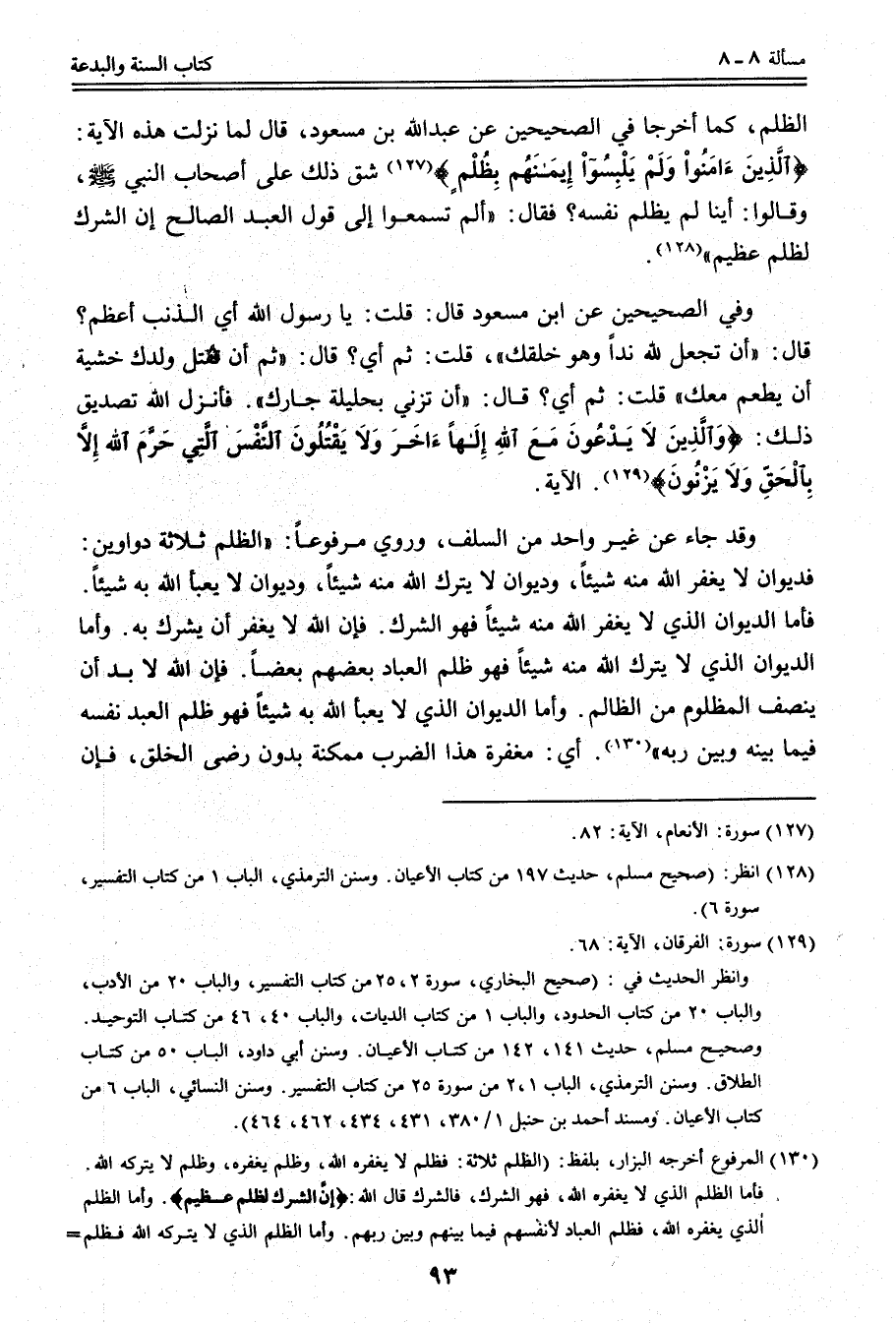 الظُّلْمِ، كَمَا أَخْرَجَا فِي الصَّحِيحَيْنِ عَنْ عَبْدِ اللَّهِ بْنِ مَسْعُودٍ، قَالَ «لَمَّا نَزَلَتْ هَذِهِ الْآيَةُ: {الَّذِينَ آمَنُوا وَلَمْ يَلْبِسُوا إِيمَانَهُمْ بِظُلْمٍ} [الأنعام: 82] شَقَّ ذَلِكَ عَلَى أَصْحَابِ النَّبِيِّ - صَلَّى اللَّهُ عَلَيْهِ وَسَلَّمَ -، وَقَالُوا: أَيُّنَا لَمْ يَظْلِمْ نَفْسَهُ؟ فَقَالَ: أَلَمْ تَسْمَعُوا إلَى قَوْلِ الْعَبْدِ الصَّالِحِ {إِنَّ الشِّرْكَ لَظُلْمٌ عَظِيمٌ} [لقمان: 13] » وَفِي الصَّحِيحَيْنِ عَنْ «ابْنِ مَسْعُودٍ قَالَ: قُلْت: يَا رَسُولَ اللَّهِ أَيُّ الذَّنْبِ أَعْظَمُ؟ قَالَ: أَنْ تَجْعَلَ لِلَّهِ نِدًّا وَهُوَ خَلَقَك، قُلْت: ثُمَّ أَيٌّ؟ قَالَ: أَنْ تَقْتُلَ وَلَدَك خَشْيَةَ أَنْ يَطْعَمَ مَعَك قُلْت: ثُمَّ أَيٌّ؟ قَالَ: أَنْ تَزْنِيَ بِحَلِيلَةِ جَارِك. فَأَنْزَلَ اللَّهُ تَصْدِيقَ ذَلِكَ: {وَالَّذِينَ لا يَدْعُونَ مَعَ اللَّهِ إِلَهًا آخَرَ وَلا يَقْتُلُونَ النَّفْسَ الَّتِي حَرَّمَ اللَّهُ إِلا بِالْحَقِّ وَلا يَزْنُونَ} [الفرقان: 68] » الْآيَةَ، وَقَدْ جَاءَ عَنْ غَيْرِ وَاحِدٍ مِنْ السَّلَفِ.