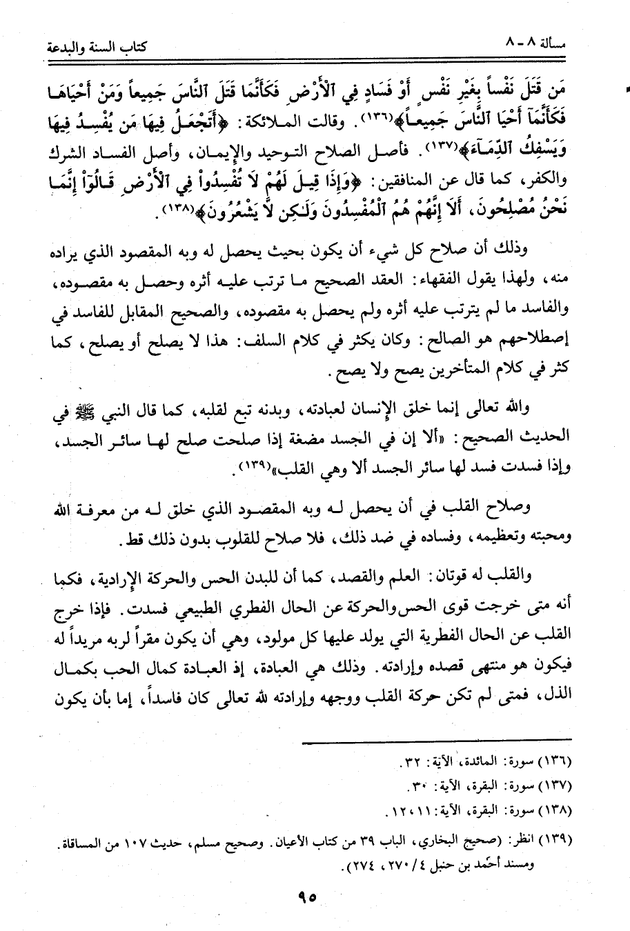 وَقَالَتْ الْمَلَائِكَةُ {أَتَجْعَلُ فِيهَا مَنْ يُفْسِدُ فِيهَا وَيَسْفِكُ الدِّمَاءَ} [البقرة: 30] . فَأَصْلُ الصَّلَاحِ التَّوْحِيدُ وَالْإِيمَانُ، وَأَصْلُ الْفَسَادِ الشِّرْكُ وَالْكُفْرُ، كَمَا قَالَ عَنْ الْمُنَافِقِينَ: {وَإِذَا قِيلَ لَهُمْ لا تُفْسِدُوا فِي الأَرْضِ قَالُوا إِنَّمَا نَحْنُ مُصْلِحُونَ} [البقرة: 11] {أَلا إِنَّهُمْ هُمُ الْمُفْسِدُونَ وَلَكِنْ لا يَشْعُرُونَ} [البقرة: 12] . وَذَلِكَ أَنَّ صَلَاحَ كُلِّ شَيْءٍ أَنْ يَكُونَ بِحَيْثُ يَحْصُلُ لَهُ وَبِهِ الْمَقْصُودُ الَّذِي يُرَادُ مِنْهُ، وَلِذَا يَقُولُ الْفُقَهَاءُ: الْعَقْدُ الصَّحِيحُ مَا تَرَتَّبَ عَلَيْهِ أَثَرُهُ وَحَصَلَ بِهِ مَقْصُودُهُ، وَالْفَاسِدُ مَا لَمْ يَتَرَتَّبْ عَلَيْهِ أَثَرُهُ وَلَمْ يَحْصُلْ بِهِ مَقْصُودُهُ، وَالصَّحِيحُ الْمُقَابِلُ لِلْفَاسِدِ فِي اصْطِلَاحِهِمْ هُوَ الصَّالِحُ: وَكَانَ يَكْثُرُ فِي كَلَامِ السَّلَفِ: هَذَا لَا يَصْلُحُ أَوْ يَصْلُحُ، كَمَا كَثُرَ فِي كَلَامِ الْمُتَأَخِّرِينَ يَصِحُّ وَلَا يَصِحُّ. وَاَللَّهُ - تَعَالَى - إنَّمَا خَلَقَ الْإِنْسَانَ لِعِبَادَتِهِ، وَبَدَنُهُ تَبَعٌ لِقَلْبِهِ، كَمَا قَالَ النَّبِيُّ - صَلَّى اللَّهُ عَلَيْهِ وَسَلَّمَ - فِي الْحَدِيثِ الصَّحِيحِ: «أَلَا إنَّ فِي الْجَسَدِ مُضْغَةً إذَا صَلُحَتْ صَلُحَ لَهَا سَائِرُ الْجَسَدِ، وَإِذَا فَسَدَتْ فَسَدَ لَهَا سَائِرُ الْجَسَدِ أَلَا وَهِيَ الْقَلْبُ» . وَصَلَاحُ الْقَلْبِ فِي أَنْ يَحْصُلَ لَهُ وَبِهِ الْمَقْصُودُ الَّذِي خُلِقَ لَهُ مِنْ مَعْرِفَةِ اللَّهِ وَمَحَبَّتِهِ وَتَعْظِيمِهِ، وَفَسَادُهُ فِي ضِدِّ ذَلِكَ، فَلَا صَلَاحَ لِلْقُلُوبِ بِدُونِ ذَلِكَ قَطُّ. وَالْقَلْبُ لَهُ قُوَّتَانِ: الْعِلْمُ وَالْقَصْدُ، كَمَا أَنَّ لِلْبَدَنِ الْحِسَّ وَالْحَرَكَةَ الْإِرَادِيَّةَ، فَكَمَا أَنَّهُ مَتَى خَرَجَتْ قُوَى الْحِسِّ وَالْحَرَكَةِ عَنْ الْحَالِ الْفِطْرِيِّ الطَّبِيعِيِّ فَسَدَتْ. فَإِذَا خَرَجَ الْقَلْبُ عَنْ الْحَالِ الْفِطْرِيَّةِ الَّتِي يُولَدُ كُلُّ مَوْلُودٍ، وَهِيَ أَنْ يَكُونَ مُقِرًّا لِرَبِّهِ مُرِيدًا لَهُ فَيَكُونُ هُوَ مُنْتَهَى قَصْدِهِ وَإِرَادَتِهِ.