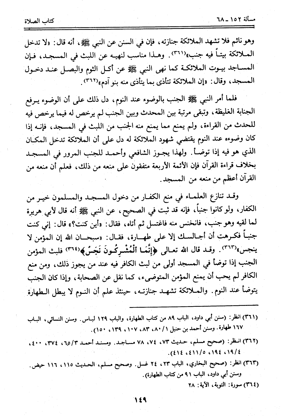 وَقَدْ قَالَ اللَّهُ تَعَالَى {إِنَّمَا الْمُشْرِكُونَ نَجَسٌ} [التوبة: 28] فَلُبْثُ الْمُؤْمِنِ الْجُنُبِ إذَا تَوَضَّأَ فِي الْمَسْجِدِ أَوْلَى مِنْ لُبْثِ الْكَافِرِ فِيهِ عِنْدَ مَنْ يُجَوِّزُ ذَلِكَ، وَمَنْ مَنَعَ الْكَافِرَ لَمْ يُحِبَّ أَنْ يَمْنَعَ الْمُؤْمِنَ الْمُتَوَضِّئَ، كَمَا نُقِلَ عَنْ الصَّحَابَةِ، فَإِذَا كَانَ الْجُنُبُ يَتَوَضَّأُ عِنْدَ النَّوْمِ. وَالْمَلَائِكَةُ تَشْهَدُ جِنَازَتَهُ، حِينَئِذٍ عُلِمَ أَنَّ النَّوْمَ لَا يُبْطِلُ الطَّهَارَةَ
