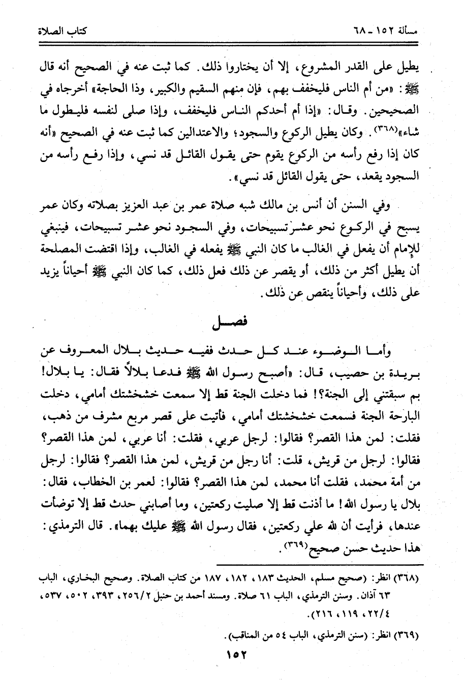 فَصْلٌ وَأَمَّا الْوُضُوءُ عِنْدَ كُلِّ حَدَثٍ فَفِيهِ حَدِيثُ بِلَالٍ الْمَعْرُوفُ عَنْ بُرَيْدَةَ بْنِ حَصِيبٍ، قَالَ: «أَصْبَحَ رَسُولُ اللَّهِ - صَلَّى اللَّهُ عَلَيْهِ وَسَلَّمَ - فَدَعَا بِلَالًا فَقَالَ: يَا بِلَالُ بِمَ سَبَقْتَنِي إلَى الْجَنَّةِ؟ ، فَمَا دَخَلْت الْجَنَّةَ قَطُّ إلَّا سَمِعْت خَشْخَشَتَك أَمَامِي، دَخَلْت الْبَارِحَةَ الْجَنَّةَ فَسَمِعْت خَشْخَشَتَك أَمَامِي، فَأَتَيْت عَلَى قَصْرٍ مُرَبَّعٍ مُشْرِفٍ مِنْ ذَهَبٍ، فَقُلْت: لِمَنْ هَذَا الْقَصْرُ؟ فَقَالُوا: لِرَجُلٍ عَرَبِيٍّ، فَقُلْت: أَنَا عَرَبِيٌّ، لِمَنْ هَذَا الْقَصْرُ؟ فَقَالُوا: لِرَجُلٍ مِنْ قُرَيْشٍ، قُلْت: أَنَا رَجُلٌ مِنْ قُرَيْشٍ، لِمَنْ هَذَا الْقَصْرُ؟ فَقَالُوا: لِرَجُلٍ مِنْ أُمَّةِ مُحَمَّدٍ، فَقُلْت أَنَا مُحَمَّدٌ، لِمَنْ هَذَا الْقَصْرُ؟ فَقَالُوا: لِعُمَرَ بْنِ الْخَطَّابِ، فَقَالَ: بِلَالٌ يَا رَسُولَ اللَّهِ، مَا أَذَّنْت قَطُّ إلَّا صَلَّيْت رَكْعَتَيْنِ، وَمَا أَصَابَنِي حَدَثٌ قَطُّ إلَّا تَوَضَّأْت عِنْدَهَا، فَرَأَيْت أَنَّ لِلَّهِ عَلَيَّ رَكْعَتَيْنِ، فَقَالَ رَسُولُ اللَّهِ - صَلَّى اللَّهُ عَلَيْهِ وَسَلَّمَ - عَلَيْك بِهِمَا» . قَالَ التِّرْمِذِيُّ: هَذَا حَدِيثٌ حَسَنٌ صَحِيحٌ.