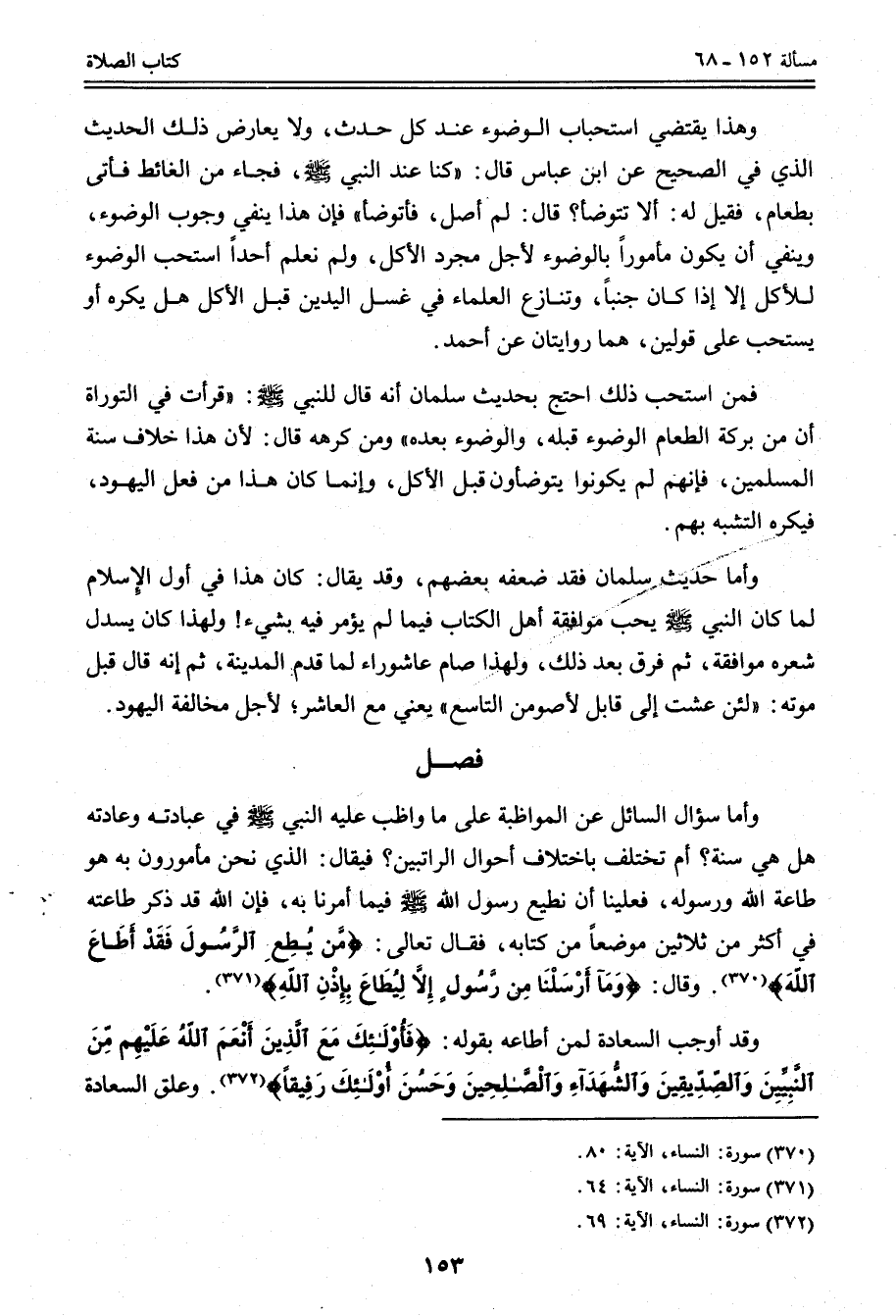 فَصْلٌ وَأَمَّا سُؤَالُ السَّائِلِ عَنْ الْمُوَاظَبَةِ عَلَى مَا وَاظَبَ عَلَيْهِ النَّبِيُّ - صَلَّى اللَّهُ عَلَيْهِ وَسَلَّمَ - فِي عِبَادَتِهِ وَعَادَتِهِ هَلْ هِيَ سُنَّةٌ؟ أَمْ تَخْتَلِفُ بِاخْتِلَافِ أَحْوَالِ الرَّاتِبِينَ؟ فَيُقَالُ: الَّذِي نَحْنُ مَأْمُورُونَ بِهِ هُوَ طَاعَةُ اللَّهِ وَرَسُولِهِ، فَعَلَيْنَا أَنْ نُطِيعَ رَسُولَ اللَّهِ - صَلَّى اللَّهُ عَلَيْهِ وَسَلَّمَ - فِيمَا أَمَرَنَا بِهِ، فَإِنَّ اللَّهَ قَدْ ذَكَرَ طَاعَتَهُ فِي أَكْثَرِ مِنْ ثَلَاثِينَ مَوْضِعًا مِنْ كِتَابِهِ، فَقَالَ تَعَالَى: {مَنْ يُطِعِ الرَّسُولَ فَقَدْ أَطَاعَ اللَّهَ} [النساء: 80] . وَقَالَ: {وَمَا أَرْسَلْنَا مِنْ رَسُولٍ إِلا لِيُطَاعَ بِإِذْنِ اللَّهِ} [النساء: 64] .