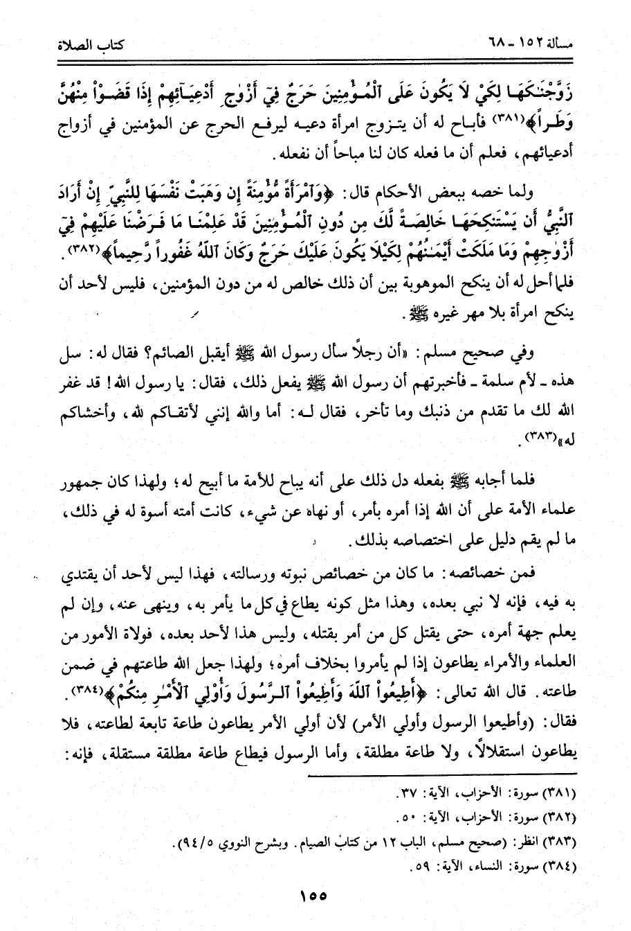 فَمِنْ خَصَائِصِهِ: مَا كَانَ مِنْ خَصَائِصِ نُبُوَّتِهِ وَرِسَالَتِهِ، فَهَذَا لَيْسَ لِأَحَدٍ أَنْ يَقْتَدِيَ بِهِ فِيهِ، فَإِنَّهُ لَا نَبِيَّ بَعْدَهُ، وَهَذَا مِثْلُ كَوْنِهِ يُطَاعُ فِي كُلِّ مَا يَأْمُرُ بِهِ، وَيَنْهَى عَنْهُ، وَإِنْ لَمْ يَعْلَمْ جِهَةَ أَمْرِهِ، حَتَّى يُقْتَلَ كُلُّ مَنْ أَمَرَ بِقَتْلِهِ، وَلَيْسَ هَذَا لِأَحَدٍ بَعْدَهُ، فَوُلَاةُ الْأُمُورِ مِنْ الْعُلَمَاءِ وَالْأُمَرَاءِ يُطَاعُونَ إذَا لَمْ يَأْمُرُوا بِخِلَافِ أَمْرِهِ؛ وَلِهَذَا جَعَلَ اللَّهُ طَاعَتَهُمْ فِي ضِمْنِ طَاعَتِهِ. قَالَ اللَّهُ تَعَالَى: {أَطِيعُوا اللَّهَ وَأَطِيعُوا الرَّسُولَ وَأُولِي الأَمْرِ مِنْكُمْ} [النساء: 59] .