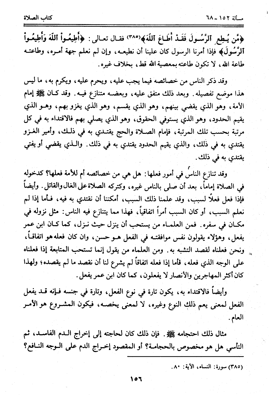 وَقَدْ ذَكَرَ النَّاسُ مِنْ خَصَائِصِهِ فِيمَا يَجِبُ عَلَيْهِ، وَيَحْرُمُ عَلَيْهِ، وَيُكْرَمُ بِهِ، مَا لَيْسَ هَذَا مَوْضِعَ تَفْصِيلِهِ. وَبَعْضُ ذَلِكَ مُتَّفَقٌ عَلَيْهِ، وَبَعْضُهُ مُتَنَازَعٌ فِيهِ. وَقَدْ كَانَ - صَلَّى اللَّهُ عَلَيْهِ وَسَلَّمَ - إمَامُ الْأُمَّةِ، وَهُوَ الَّذِي يَقْضِي بَيْنَهُمْ، وَهُوَ الَّذِي يُقَسِّمُ، وَهُوَ الَّذِي يَغْزُو بِهِمْ، وَهُوَ الَّذِي يُقِيمُ الْحُدُودَ، وَهُوَ الَّذِي يَسْتَوْفِي الْحُقُوقَ، وَهُوَ الَّذِي يُصَلِّي بِهِمْ فَالِاقْتِدَاءُ بِهِ فِي كُلِّ مَرْتَبَةٍ بِحَسَبِ تِلْكَ الْمَرْتَبَةِ، فَإِمَامُ الصَّلَاةِ وَالْحَجِّ يَقْتَدِي بِهِ فِي ذَلِكَ، وَأَمِيرُ الْغَزْوِ يَقْتَدِي بِهِ فِي ذَلِكَ، وَاَلَّذِي يُقِيمُ الْحُدُودَ يَقْتَدِي بِهِ فِي ذَلِكَ. وَاَلَّذِي يَقْضِي أَوْ يُفْتِي يَقْتَدِي بِهِ فِي ذَلِكَ.
