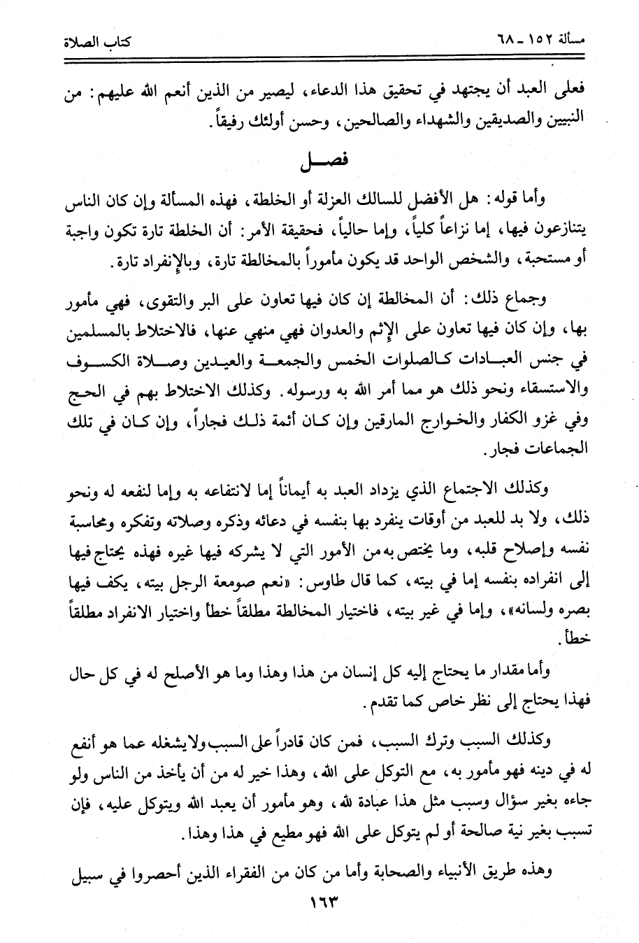 فَصْلٌ وَأَمَّا قَوْلُهُ: هَلْ الْأَفْضَلُ لِلسَّالِكِ الْعُزْلَةُ أَوْ الْخُلْطَةُ، فَهَذِهِ الْمَسْأَلَةُ وَإِنْ كَانَ النَّاسُ يَتَنَازَعُونَ فِيهَا، إمَّا نِزَاعًا كُلِّيًّا، وَإِمَّا حَالِيًّا، فَحَقِيقَةُ الْأَمْرِ: أَنَّ الْخُلْطَةَ تَارَةً تَكُونُ وَاجِبَةً أَوْ مُسْتَحَبَّةً، وَالشَّخْصُ الْوَاحِدُ قَدْ يَكُونُ مَأْمُورًا بِالْمُخَالَطَةِ تَارَةً، وَبِالِانْفِرَادِ تَارَةً.