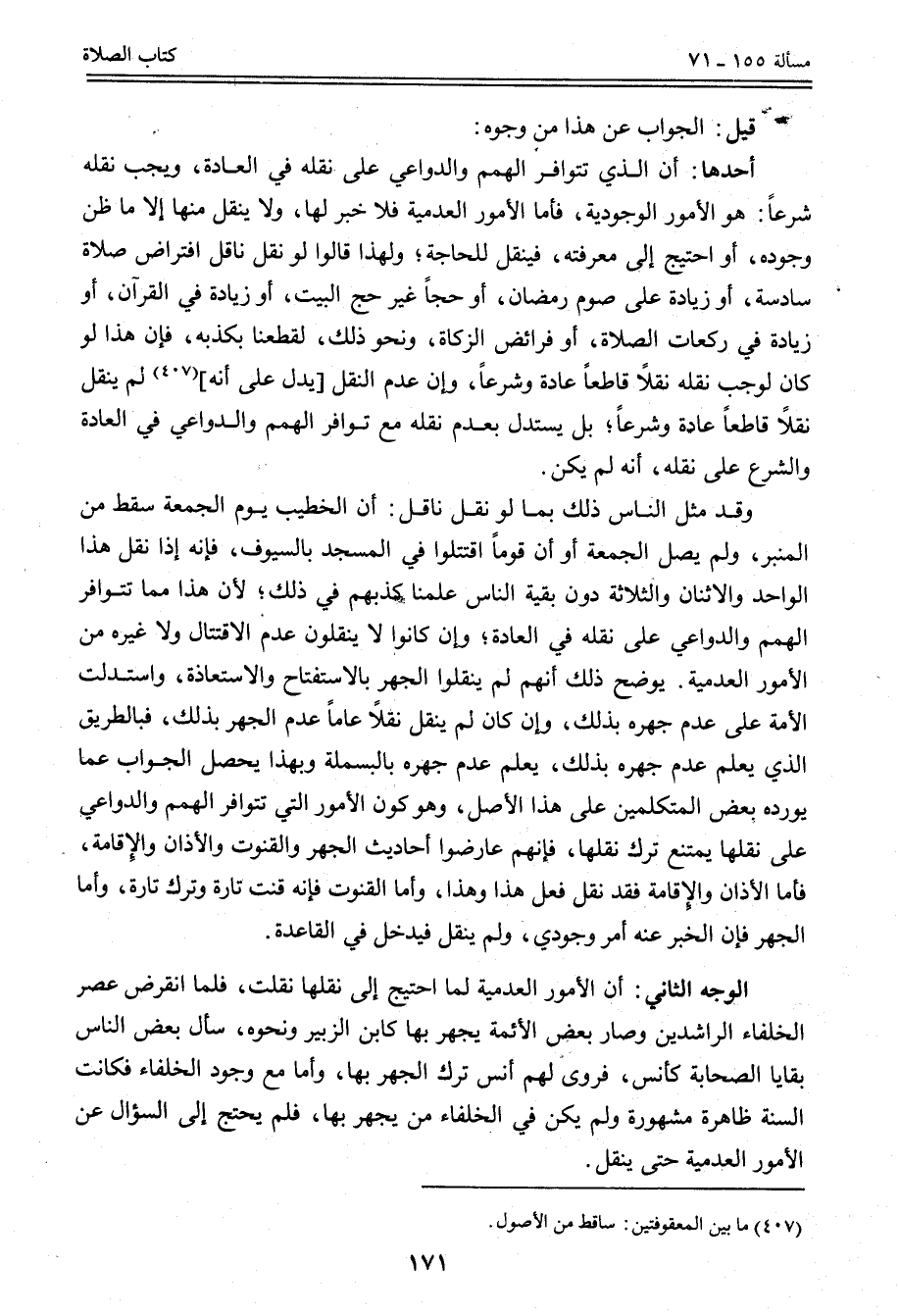 قِيلَ: الْجَوَابُ عَنْ هَذَا مِنْ وُجُوهٍ أَحَدُهَا: أَنَّ الَّذِي تَتَوَافَرُ الْهِمَمُ وَالدَّوَاعِي عَلَى نَقْلِهِ فِي الْعَادَةِ، وَيَجِبُ نَقْلُهُ شَرْعًا: هُوَ الْأُمُورُ الْوُجُودِيَّةُ، فَأَمَّا الْأُمُورُ الْعَدَمِيَّةُ فَلَا خَبَرَ لَهَا، وَلَا يُنْقَلُ مِنْهَا إلَّا مَا ظُنَّ وُجُودُهُ، أَوْ اُحْتِيجَ إلَى مَعْرِفَتِهِ، فَيُنْقَلُ لِلْحَاجَةِ؛ وَلِهَذَا قَالُوا لَوْ نَقَلَ نَاقِلٌ افْتِرَاضَ صَلَاةٍ سَادِسَةٍ، أَوْ زِيَادَةً عَلَى صَوْمِ رَمَضَانَ، أَوْ حَجًّا غَيْرَ حَجِّ الْبَيْتِ، أَوْ زِيَادَةً فِي الْقُرْآنِ، أَوْ زِيَادَةً فِي رَكَعَاتِ الصَّلَاةِ، أَوْ فَرَائِضِ الزَّكَاةِ، وَنَحْوَ ذَلِكَ، لَقَطَعْنَا بِكَذِبِهِ، فَإِنَّ هَذَا لَوْ كَانَ لَوَجَبَ نَقْلُهُ نَقْلًا قَاطِعًا عَادَةً وَشَرْعًا، وَإِنْ عُدِمَ النَّقْلُ [يَدُلُّ عَلَى أَنَّهُ] لَمْ يُنْقَلْ نَقْلًا قَاطِعًا عَادَةً وَشَرْعًا؛ بَلْ يُسْتَدَلُّ بِعَدَمِ نَقْلِهِ مَعَ تَوَافُرِ الْهِمَمِ وَالدَّوَاعِي فِي الْعَادَةِ وَالشَّرْعِ عَلَى نَقْلِهِ، أَنَّهُ لَمْ يَكُنْ.