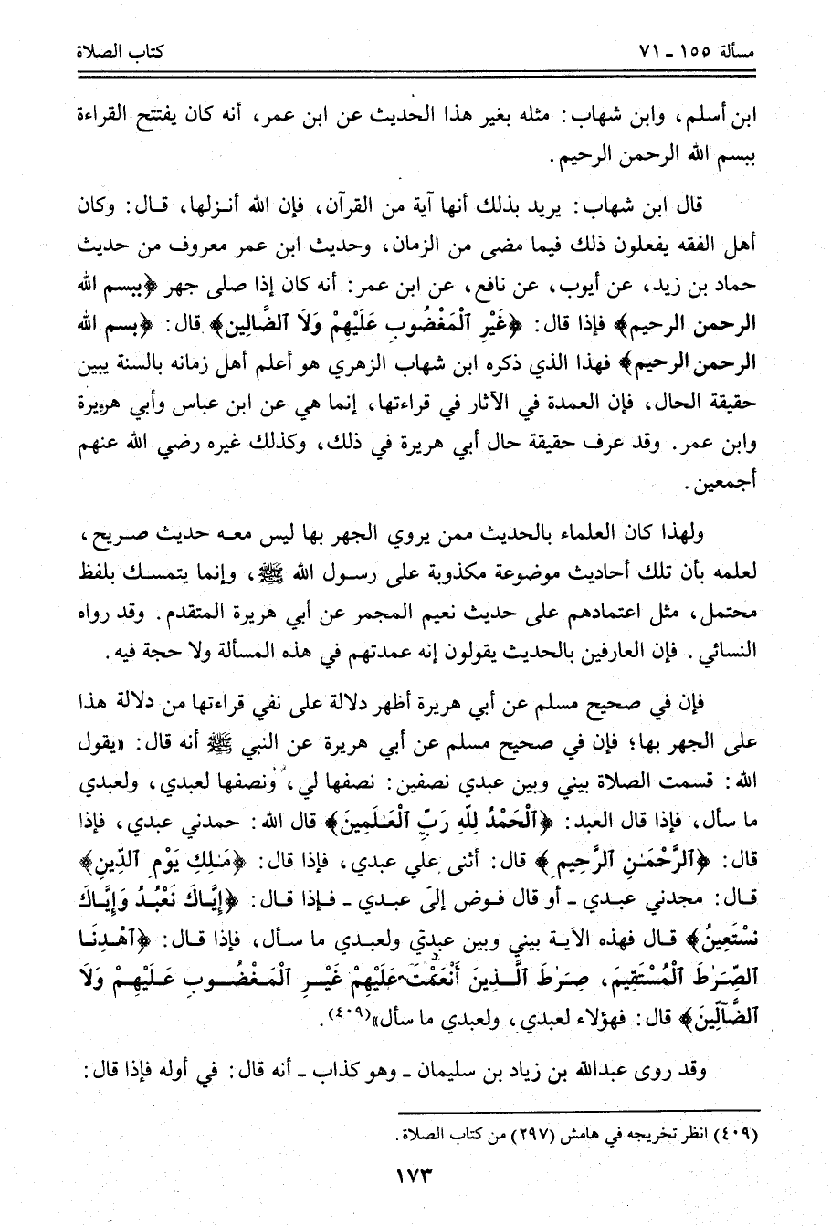 فَإِنَّ فِي صَحِيحِ مُسْلِمٍ عَنْ أَبِي هُرَيْرَةَ أَظْهَرُ دَلَالَةٍ عَلَى نَفْيِ قِرَاءَتِهَا مِنْ دَلَالَةِ هَذَا عَلَى الْجَهْرِ بِهَا؛ فَإِنَّ فِي صَحِيحِ مُسْلِمٍ عَنْ أَبِي هُرَيْرَةَ عَنْ النَّبِيِّ - صَلَّى اللَّهُ عَلَيْهِ وَسَلَّمَ - أَنَّهُ قَالَ: «يَقُولُ اللَّهُ: قَسَمْت الصَّلَاةَ بَيْنِي وَبَيْنَ عَبْدِي نِصْفَيْنِ: نِصْفُهَا لِي، وَنِصْفُهَا لِعَبْدِي، وَلِعَبْدِي مَا سَأَلَ، فَإِذَا قَالَ الْعَبْدُ: {الْحَمْدُ لِلَّهِ رَبِّ الْعَالَمِينَ} [الفاتحة: 2] قَالَ اللَّهُ: حَمِدَنِي عَبْدِي، فَإِذَا قَالَ: {الرَّحْمَنِ الرَّحِيمِ} [الفاتحة: 3] قَالَ: أَثْنَى عَلَيَّ عَبْدِي، فَإِذَا قَالَ: {مَالِكِ يَوْمِ الدِّينِ} [الفاتحة: 4] قَالَ: مَجَّدَنِي عَبْدِي - أَوْ قَالَ فَوَّضَ إلَيَّ عَبْدِي - فَإِذَا قَالَ: {إِيَّاكَ نَعْبُدُ وَإِيَّاكَ نَسْتَعِينُ} [الفاتحة: 5] قَالَ فَهَذِهِ الْآيَةُ بَيْنِي وَبَيْنَ عَبْدِي وَلِعَبْدِي مَا سَأَلَ، فَإِذَا قَالَ {اهْدِنَا الصِّرَاطَ الْمُسْتَقِيمَ} [الفاتحة: 6] {صِرَاطَ الَّذِينَ أَنْعَمْتَ عَلَيْهِمْ غَيْرِ الْمَغْضُوبِ عَلَيْهِمْ وَلا الضَّالِّينَ} [الفاتحة: 7] قَالَ: فَهَؤُلَاءِ لِعَبْدِي، وَلِعَبْدِي مَا سَأَلَ» وَقَدْ رَوَى عَبْدُ اللَّهِ بْنُ زِيَادِ بْنِ سُلَيْمَانَ - وَهُوَ كَذَّابٌ - أَنَّهُ قَالَ: فِي أَوَّلِهِ «فَإِذَا قَالَ: