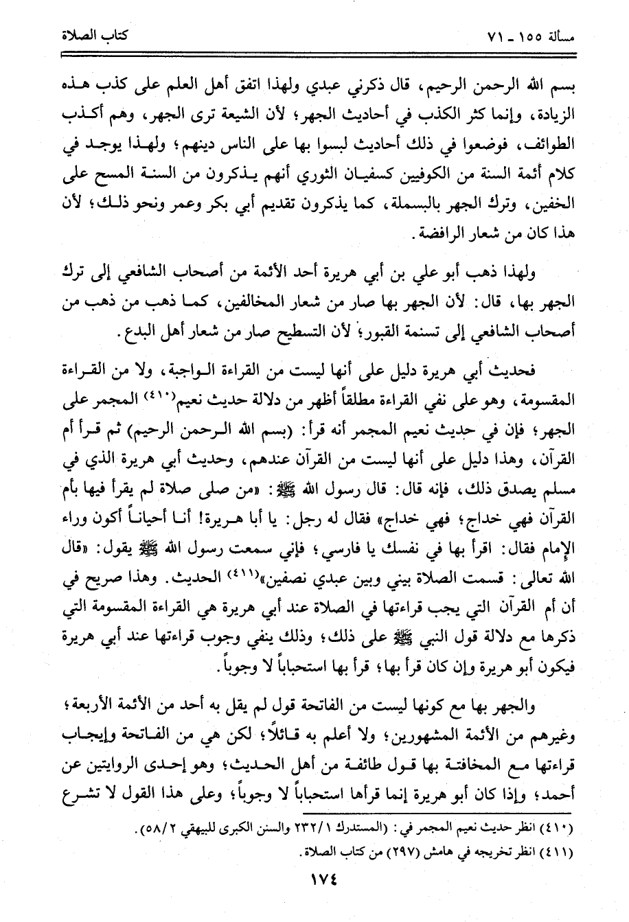 فَحَدِيثُ أَبِي هُرَيْرَةَ دَلِيلٌ عَلَى أَنَّهَا لَيْسَتْ مِنْ الْقِرَاءَةِ الْوَاجِبَةِ، وَلَا مِنْ الْقِرَاءَةِ الْمَقْسُومَةِ، وَهُوَ عَلَى نَفْيِ الْقِرَاءَةِ مُطْلَقًا أَظْهَرُ مِنْ دَلَالَةِ حَدِيثِ نُعَيْمٍ الْمُجْمِرِ عَلَى الْجَهْرِ؛ فَإِنَّ فِي حَدِيثِ نُعَيْمٍ الْمُجْمِرِ «أَنَّهُ قَرَأَ: بِسْمِ اللَّهِ الرَّحْمَنِ الرَّحِيمِ ثُمَّ قَرَأَ أُمَّ الْقُرْآنِ» ، وَهَذَا دَلِيلٌ عَلَى أَنَّهَا لَيْسَتْ مِنْ الْقُرْآنِ عِنْدَهُمْ، وَحَدِيثُ أَبِي هُرَيْرَةَ الَّذِي فِي مُسْلِمٍ يُصَدِّقُ ذَلِكَ، فَإِنَّهُ قَالَ: قَالَ رَسُولُ اللَّهِ - صَلَّى اللَّهُ عَلَيْهِ وَسَلَّمَ -: «مَنْ صَلَّى صَلَاةً لَمْ يَقْرَأْ فِيهَا بِأُمِّ الْقُرْآنِ فَهِيَ خِدَاجٌ؛ فَهِيَ خِدَاجٌ فَقَالَ لَهُ رَجُلٌ: يَا أَبَا هُرَيْرَةَ، أَنَا أَحْيَانًا أَكُونُ وَرَاءَ الْإِمَامِ فَقَالَ: اقْرَأْ بِهَا فِي نَفْسِك يَا فَارِسِيُّ؛ فَإِنِّي سَمِعْت رَسُولَ اللَّهِ - صَلَّى اللَّهُ عَلَيْهِ وَسَلَّمَ - يَقُولُ: قَالَ اللَّهُ تَعَالَى: قَسَمْت الصَّلَاةَ بَيْنِي وَبَيْنَ عَبْدِي نِصْفَيْنِ» الْحَدِيثَ.