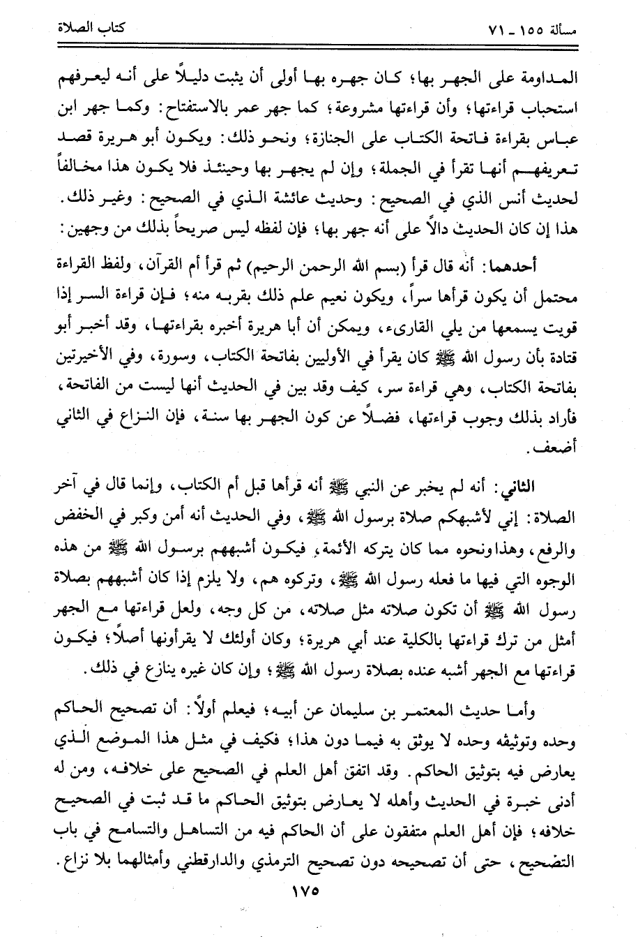 الْمُدَاوَمَةُ عَلَى الْجَهْرِ بِهَا؛ كَانَ جَهْرُهُ بِهَا أَوْلَى أَنْ يَثْبُتَ دَلِيلًا عَلَى أَنَّهُ لِيُعَرِّفَهُمْ اسْتِحْبَابَ قِرَاءَتِهَا؛ وَأَنَّ قِرَاءَتَهَا مَشْرُوعَةٌ؛ كَمَا جَهَرَ عُمَرُ بِالِاسْتِفْتَاحِ: وَكَمَا جَهَرَ ابْنُ عَبَّاسٍ بِقِرَاءَةِ فَاتِحَةِ الْكِتَابِ عَلَى الْجِنَازَةِ؛ وَنَحْوِ ذَلِكَ: وَيَكُونُ أَبُو هُرَيْرَةَ قَصَدَ تَعْرِيفَهُمْ أَنَّهَا تُقْرَأُ فِي الْجُمْلَةِ؛ وَإِنْ لَمْ يَجْهَرْ بِهَا وَحِينَئِذٍ فَلَا يَكُونُ هَذَا مُخَالِفًا لِحَدِيثِ أَنَسٍ الَّذِي فِي الصَّحِيحِ: وَحَدِيثِ عَائِشَةَ الَّذِي فِي الصَّحِيحِ: وَغَيْرِ ذَلِكَ. هَذَا إنْ كَانَ الْحَدِيثُ دَالًّا عَلَى أَنَّهُ جَهَرَ بِهَا؛ فَإِنَّ لَفْظَهُ لَيْسَ صَرِيحًا بِذَلِكَ مِنْ وَجْهَيْنِ أَحَدُهُمَا: أَنَّهُ قَالَ قَرَأَ (بِسْمِ اللَّهِ الرَّحْمَنِ الرَّحِيمِ) ثُمَّ قَرَأَ أُمَّ الْقُرْآنِ، وَلَفْظُ الْقِرَاءَةِ مُحْتَمِلٌ أَنْ يَكُونَ قَرَأَهَا سِرًّا، وَيَكُونُ نُعَيْمٌ عَلِمَ ذَلِكَ بِقُرْبِهِ مِنْهُ؛ فَإِنَّ قِرَاءَةَ السِّرِّ إذَا قَوِيَتْ يَسْمَعُهَا مَنْ يَلِي الْقَارِئَ، وَيُمْكِنُ أَنَّ أَبَا هُرَيْرَةَ أَخْبَرَهُ بِقِرَاءَتِهَا، وَقَدْ أَخْبَرَ أَبُو قَتَادَةَ بِأَنَّ «رَسُولَ اللَّهِ - صَلَّى اللَّهُ عَلَيْهِ وَسَلَّمَ - كَانَ يَقْرَأُ فِي الْأُولَيَيْنِ بِفَاتِحَةِ الْكِتَابِ، وَسُورَةٍ، وَفِي الْأَخِيرَتَيْنِ بِفَاتِحَةِ الْكِتَابِ» ، وَهِيَ قِرَاءَةُ سِرٍّ، كَيْفَ وَقَدْ بَيَّنَ فِي الْحَدِيثِ أَنَّهَا لَيْسَتْ مِنْ الْفَاتِحَةِ، فَأَرَادَ بِذَلِكَ وُجُوبَ قِرَاءَتِهَا، فَضْلًا عَنْ كَوْنِ الْجَهْرِ بِهَا سُنَّةً، فَإِنَّ النِّزَاعَ فِي الثَّانِي أَضْعَفُ. الثَّانِي: أَنَّهُ لَمْ يُخْبِرْ عَنْ النَّبِيِّ - صَلَّى اللَّهُ عَلَيْهِ وَسَلَّمَ - أَنَّهُ قَرَأَهَا قَبْلَ أُمِّ الْكِتَابِ، وَإِنَّمَا قَالَ فِي آخِرِ الصَّلَاةِ: إنِّي لَأَشْبَهَكُمْ صَلَاةً بِرَسُولِ اللَّهِ - صَلَّى اللَّهُ عَلَيْهِ وَسَلَّمَ - وَفِي الْحَدِيثِ أَنَّهُ أَمَّنَ وَكَبَّرَ فِي الْخَفْضِ وَالرَّفْعِ، وَهَذَا وَنَحْوُهُ مِمَّا كَانَ يَتْرُكُهُ الْأَئِمَّةُ، فَيَكُونُ أَشْبَهَهُمْ بِرَسُولِ اللَّهِ - صَلَّى اللَّهُ عَلَيْهِ وَسَلَّمَ - مِنْ هَذِهِ الْوُجُوهِ الَّتِي فِيهَا مَا فَعَلَهُ رَسُولُ اللَّهِ - صَلَّى اللَّهُ عَلَيْهِ وَسَلَّمَ - وَتَرَكُوهُ هُمْ، وَلَا يَلْزَمُ إذَا كَانَ أَشْبَهَهُمْ بِصَلَاةِ رَسُولِ اللَّهِ - صَلَّى اللَّهُ عَلَيْهِ وَسَلَّمَ - أَنْ تَكُونَ صَلَاتُهُ مِثْلَ صَلَاتِهِ، مِنْ كُلِّ وَجْهٍ، وَلَعَلَّ قِرَاءَتَهَا مَعَ الْجَهْرِ أَمْثَلُ مِنْ تَرْكِ قِرَاءَتِهَا بِالْكُلِّيَّةِ عِنْدَ أَبِي هُرَيْرَةَ؛ وَكَانَ أُولَئِكَ لَا يَقْرَءُونَهَا أَصْلًا؛ فَيَكُونُ قِرَاءَتُهَا مَعَ الْجَهْرِ أَشْبَهَ عِنْدَهُ بِصَلَاةِ رَسُولِ اللَّهِ - صَلَّى اللَّهُ عَلَيْهِ وَسَلَّمَ -؛ وَإِنْ كَانَ غَيْرُهُ يُنَازِعُ فِي ذَلِكَ.