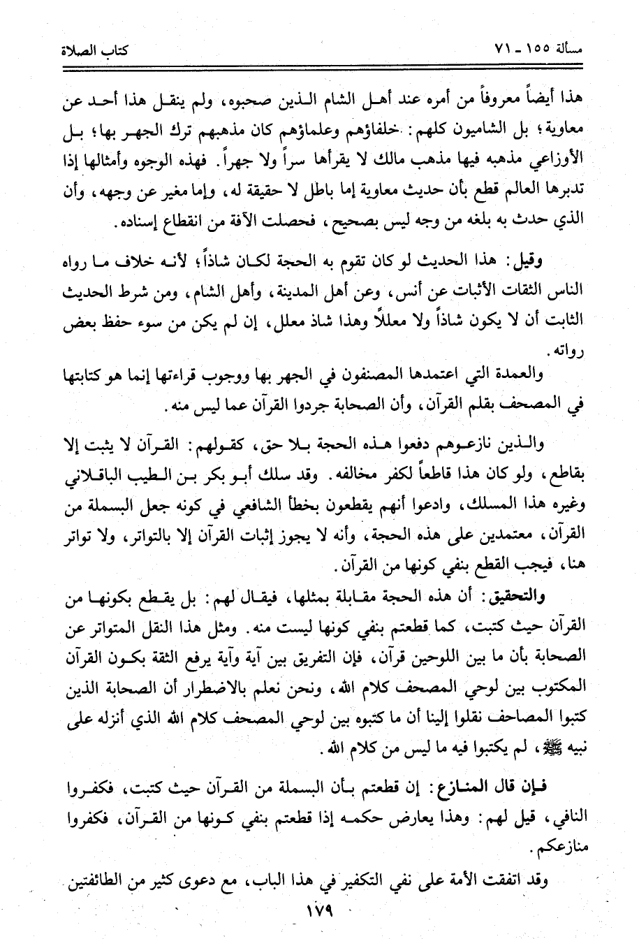 وَاَلَّذِينَ نَازَعُوهُمْ دَفَعُوا هَذِهِ الْحُجَّةَ بِلَا حَقٍّ، كَقَوْلِهِمْ: الْقُرْآنُ لَا يَثْبُتُ إلَّا بِقَاطِعٍ، وَلَوْ كَانَ هَذَا قَاطِعًا لَكَفَرَ مُخَالِفُهُ. وَقَدْ سَلَكَ أَبُو بَكْرِ بْنُ الطَّيِّبِ الْبَاقِلَّانِيُّ وَغَيْرُهُ هَذَا الْمَسْلَكَ، وَادَّعَوْا أَنَّهُمْ يَقْطَعُونَ بِخَطَأِ الشَّافِعِيِّ فِي كَوْنِهِ جَعَلَ الْبَسْمَلَةَ مِنْ الْقُرْآنِ، مُعْتَمَدِينَ عَلَى هَذِهِ الْحُجَّةِ، وَأَنَّهُ لَا يَجُوزُ إثْبَاتُ الْقُرْآنِ إلَّا بِالتَّوَاتُرِ، وَلَا تَوَاتُرَ هُنَا، فَيَجِبُ الْقَطْعُ بِنَفْيِ كَوْنِهَا مِنْ الْقُرْآنِ. وَالتَّحْقِيقُ: أَنَّ هَذِهِ الْحُجَّةَ مُقَابَلَةٌ بِمِثْلِهَا، فَيُقَالُ لَهُمْ: بَلْ يُقْطَعُ بِكَوْنِهَا مِنْ الْقُرْآنِ حَيْثُ كُتِبَتْ، كَمَا قَطَعْتُمْ بِنَفْيِ كَوْنِهَا لَيْسَتْ مِنْهُ.
