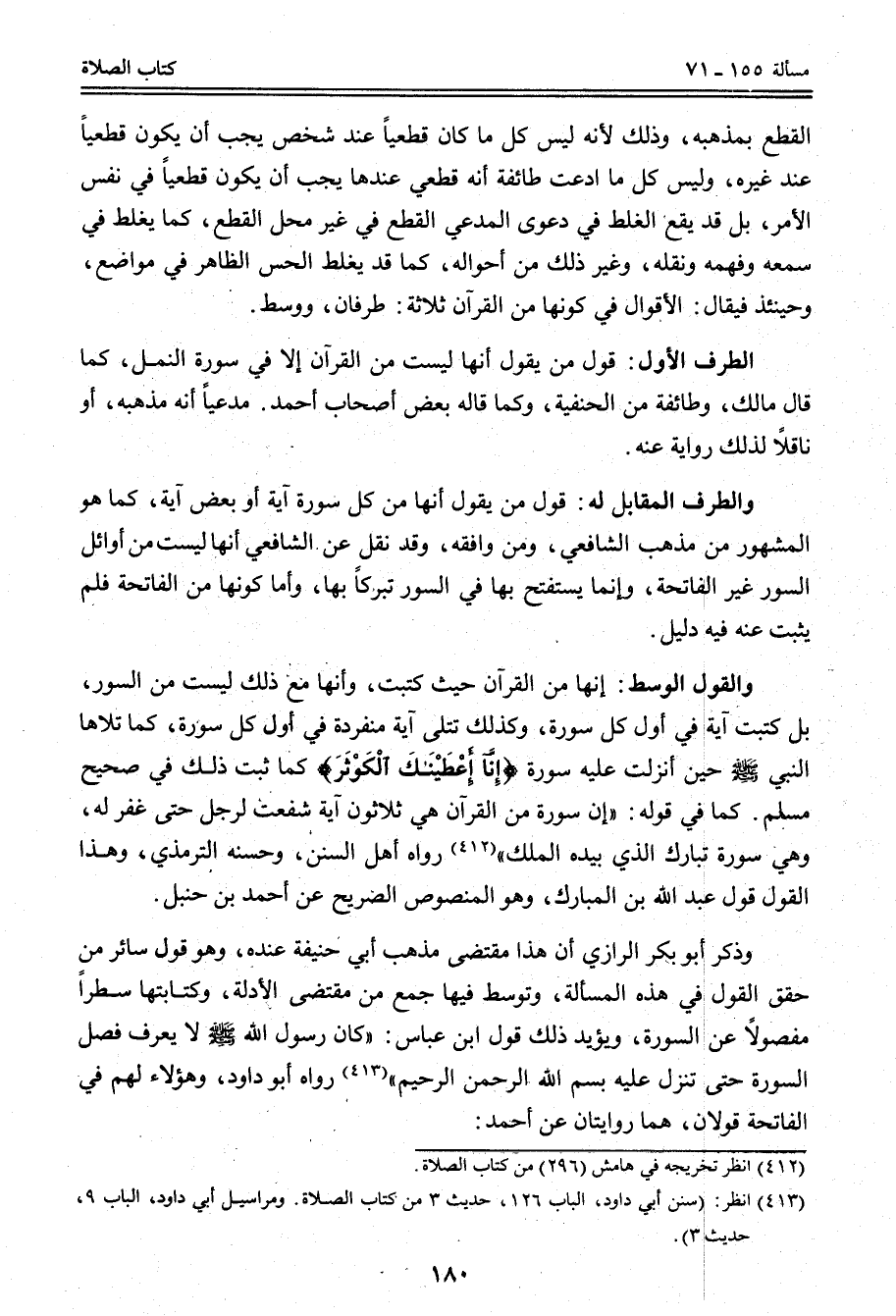 وَذَكَرَ أَبُو بَكْرٍ الرَّازِيّ أَنَّ هَذَا مُقْتَضَى مَذْهَبِ أَبِي حَنِيفَةَ عِنْدَهُ، وَهُوَ قَوْلُ سَائِرِ مَنْ حَقَّقَ الْقَوْلَ فِي هَذِهِ الْمَسْأَلَةِ، وَتَوَسَّطَ فِيهَا جَمْعٌ مِنْ مُقْتَضَى الْأَدِلَّةِ، وَكِتَابَتِهَا سَطْرًا مَفْصُولًا عَنْ السُّورَةِ، وَيُؤَيِّدُ ذَلِكَ قَوْلُ ابْنِ عَبَّاسٍ: «كَانَ رَسُولُ اللَّهِ - صَلَّى اللَّهُ عَلَيْهِ وَسَلَّمَ - لَا يَعْرِفُ فَصْلَ السُّورَةِ حَتَّى تَنْزِلَ عَلَيْهِ بِسْمِ اللَّهِ الرَّحْمَنِ الرَّحِيمِ» رَوَاهُ أَبُو دَاوُد، وَهَؤُلَاءِ لَهُمْ فِي الْفَاتِحَةِ قَوْلَانِ، هُمَا رِوَايَتَانِ عَنْ أَحْمَدَ: