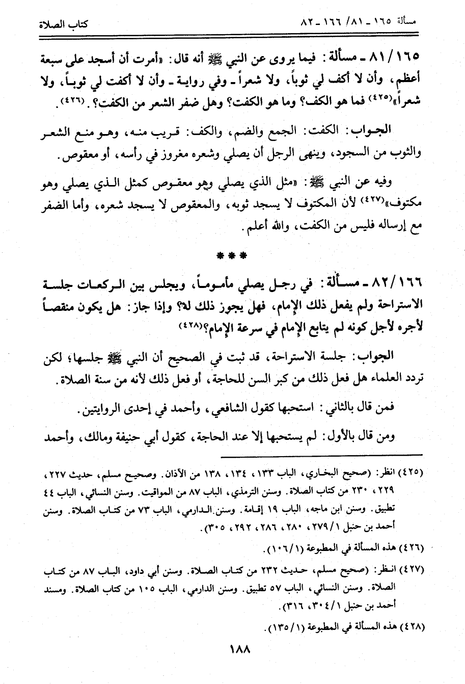 وَفِيهِ عَنْ النَّبِيِّ - صَلَّى اللَّهُ عَلَيْهِ وَسَلَّمَ -: «مَثَلُ الَّذِي يُصَلِّي وَهُوَ مَعْقُوصٌ كَمَثَلِ الَّذِي يُصَلِّي وَهُوَ مَكْتُوفٌ» لِأَنَّ الْمَكْتُوفَ لَا يَسْجُدُ ثَوْبُهُ، وَالْمَعْقُوصَ لَا يَسْجُدُ شَعْرُهُ، وَأَمَّا الضَّفْرُ مَعَ إرْسَالِهِ فَلَيْسَ مِنْ الْكَفْتِ، وَاَللَّهُ أَعْلَمُ.