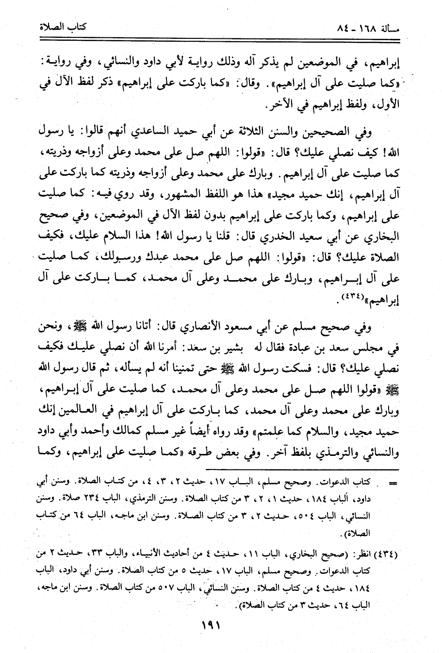 إبْرَاهِيمَ، فِي الْمَوْضِعَيْنِ لَمْ يَذْكُرْ آلَهُ وَذَلِكَ رِوَايَةٌ لِأَبِي دَاوُد وَالنَّسَائِيُّ، وَفِي رِوَايَةٍ: «كَمَا صَلَّيْت عَلَى آلِ إبْرَاهِيمَ» . وَقَالَ: «كَمَا بَارَكْت عَلَى إبْرَاهِيمَ» ذَكَرَ لَفْظَ الْآلِ فِي الْأَوَّلِ، وَلَفْظَ إبْرَاهِيمَ فِي الْآخِرِ. وَفِي الصَّحِيحَيْنِ وَالسُّنَنِ الثَّلَاثَةِ عَنْ أَبِي حُمَيْدٍ السَّاعِدِيِّ أَنَّهُمْ قَالُوا: «يَا رَسُولَ اللَّهِ، كَيْفَ نُصَلِّي عَلَيْك؟ قَالَ: قُولُوا: اللَّهُمَّ صَلِّ عَلَى مُحَمَّدٍ وَعَلَى أَزْوَاجِهِ وَذُرِّيَّتِهِ، كَمَا صَلَّيْت عَلَى آلِ إبْرَاهِيمَ. وَبَارِكْ عَلَى مُحَمَّدٍ وَعَلَى أَزْوَاجِهِ وَذُرِّيَّتِهِ كَمَا بَارَكْت عَلَى آلِ إبْرَاهِيمَ، إنَّك حَمِيدٌ مَجِيدٌ» هَذَا هُوَ اللَّفْظُ الْمَشْهُورُ، وَقَدْ رُوِيَ فِيهِ: «كَمَا صَلَّيْت عَلَى إبْرَاهِيمَ» ، وَكَمَا «بَارَكْت عَلَى إبْرَاهِيمَ» بِدُونِ لَفْظِ الْآلِ فِي الْمَوْضِعَيْنِ، وَفِي صَحِيحِ الْبُخَارِيِّ عَنْ أَبِي سَعِيدٍ الْخُدْرِيِّ قَالَ: «قُلْنَا يَا رَسُولَ اللَّهِ، هَذَا السَّلَامُ عَلَيْك، فَكَيْفَ الصَّلَاةُ عَلَيْك؟ قَالَ: قُولُوا: اللَّهُمَّ صَلِّ عَلَى مُحَمَّدٍ عَبْدِك وَرَسُولِك، كَمَا صَلَّيْت عَلَى آلِ إبْرَاهِيمَ، وَبَارِكْ عَلَى مُحَمَّدٍ وَعَلَى آلِ مُحَمَّدٍ، كَمَا بَارَكْت عَلَى آلِ إبْرَاهِيمَ» . وَفِي صَحِيحِ مُسْلِمٍ عَنْ أَبِي مَسْعُودٍ الْأَنْصَارِيِّ قَالَ: «أَتَانَا رَسُولُ اللَّهِ - صَلَّى اللَّهُ عَلَيْهِ وَسَلَّمَ - وَنَحْنُ فِي مَجْلِسِ سَعْدِ بْنِ عُبَادَةَ فَقَالَ لَهُ بَشِيرُ بْنُ سَعْدٍ: أَمَرَنَا اللَّهُ أَنْ نُصَلِّيَ عَلَيْك فَكَيْفَ نُصَلِّي عَلَيْك؟ قَالَ: فَسَكَتَ رَسُولُ اللَّهِ - صَلَّى اللَّهُ عَلَيْهِ وَسَلَّمَ - حَتَّى تَمَنَّيْنَا أَنَّهُ لَمْ يَسْأَلْهُ، ثُمَّ قَالَ رَسُولُ اللَّهِ - صَلَّى اللَّهُ عَلَيْهِ وَسَلَّمَ - قُولُوا اللَّهُمَّ صَلِّ عَلَى مُحَمَّدٍ وَعَلَى آلِ مُحَمَّدٍ، كَمَا صَلَّيْت عَلَى آلِ إبْرَاهِيمَ، وَبَارِكْ عَلَى مُحَمَّدٍ وَعَلَى آلِ مُحَمَّدٍ، كَمَا بَارَكْت عَلَى آلِ إبْرَاهِيمَ فِي الْعَالَمِينَ إنَّك حَمِيدٌ مَجِيدٌ، وَالسَّلَامُ كَمَا عَلِمْتُمْ» وَقَدْ رَوَاهُ أَيْضًا غَيْرُ مُسْلِمٍ كَمَالِكٍ وَأَحْمَدَ وَأَبِي دَاوُد وَالنَّسَائِيُّ وَالتِّرْمِذِيِّ بِلَفْظٍ آخَرَ.