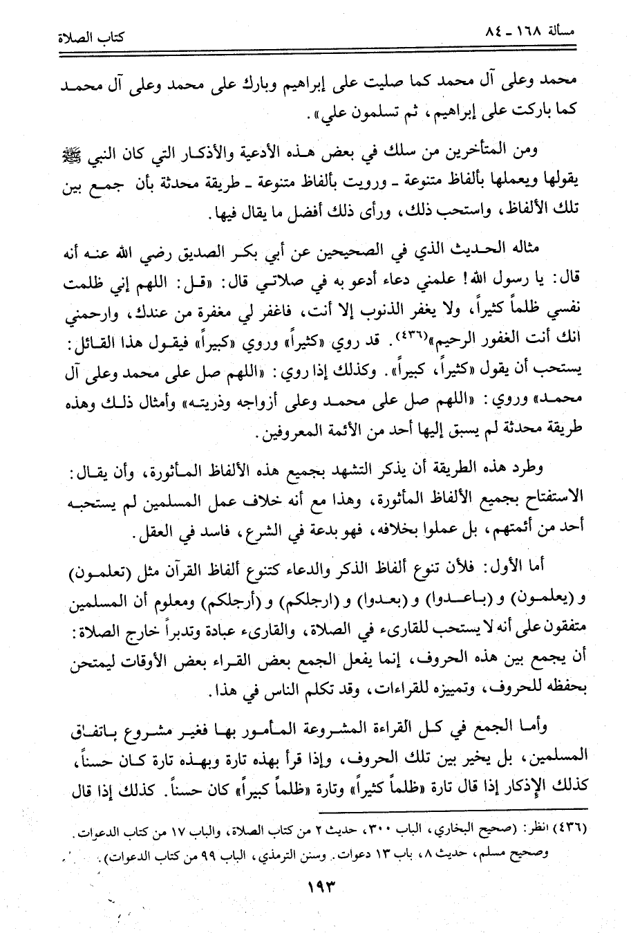 مِثَالُهُ الْحَدِيثُ الَّذِي فِي الصَّحِيحَيْنِ عَنْ «أَبِي بَكْرٍ الصِّدِّيقِ - رَضِيَ اللَّهُ عَنْهُ - أَنَّهُ قَالَ: يَا رَسُولَ اللَّهِ، عَلِّمْنِي دُعَاءً أَدْعُو بِهِ فِي صَلَاتِي قَالَ: قُلْ: اللَّهُمَّ إنِّي ظَلَمْتُ نَفْسِي ظُلْمًا كَثِيرًا، وَلَا يَغْفِرُ الذُّنُوبَ إلَّا أَنْتَ، فَاغْفِرْ لِي مَغْفِرَةً مِنْ عِنْدَك، وَارْحَمْنِي إنَّك أَنْتَ الْغَفُورُ الرَّحِيمُ» . قَدْ رُوِيَ " كَثِيرًا " وَرُوِيَ " كَبِيرًا " فَيَقُولُ هَذَا الْقَائِلُ: يُسْتَحَبُّ أَنْ يَقُولَ " كَثِيرًا، كَبِيرًا ". وَكَذَلِكَ إذَا رُوِيَ: «اللَّهُمَّ صَلِّ عَلَى مُحَمَّدٍ وَعَلَى آلِ مُحَمَّدٍ» وَرُوِيَ: «اللَّهُمَّ صَلِّ عَلَى مُحَمَّدٍ وَعَلَى أَزْوَاجِهِ وَذُرِّيَّتِهِ» وَأَمْثَالُ ذَلِكَ وَهَذِهِ طَرِيقَةٌ مُحْدَثَةٌ لَمْ يَسْبِقْ إلَيْهَا أَحَدٌ مِنْ الْأَئِمَّةِ الْمَعْرُوفِينَ.