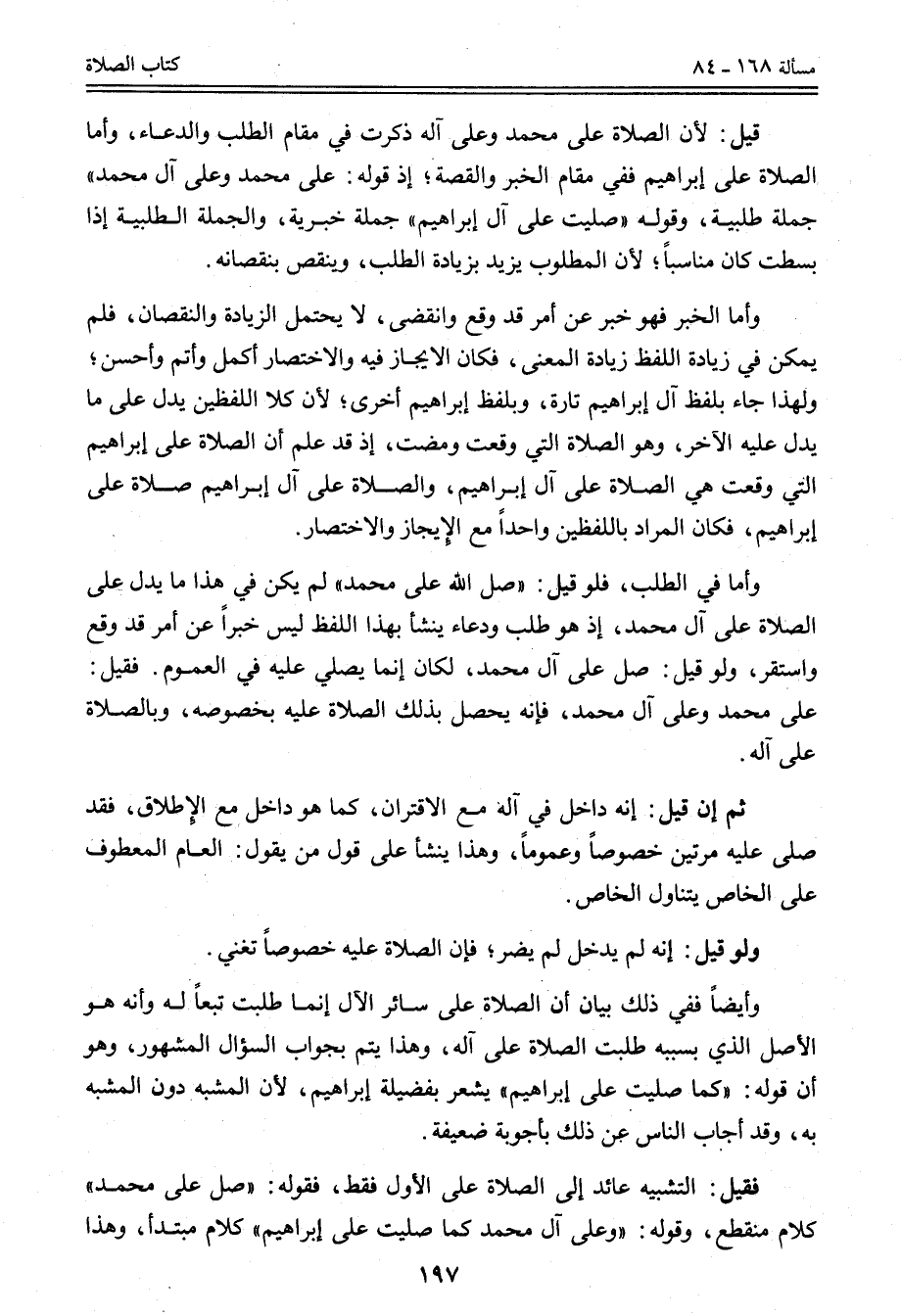 وَأَيْضًا فَفِي ذَلِكَ بَيَانُ أَنَّ الصَّلَاةَ عَلَى سَائِرِ الْآلِ إنَّمَا طُلِبَتْ تَبَعًا لَهُ وَأَنَّهُ هُوَ الْأَصْلُ الَّذِي بِسَبَبِهِ طُلِبَتْ الصَّلَاةُ عَلَى آلِهِ، وَهَذَا يَتِمُّ بِجَوَابِ السُّؤَالِ الْمَشْهُورِ، وَهُوَ أَنَّ قَوْلَهُ: " كَمَا صَلَّيْت عَلَى إبْرَاهِيمَ " يُشْعِرُ بِفَضِيلَةِ إبْرَاهِيمَ، لِأَنَّ الْمُشَبَّهَ دُونَ الْمُشَبَّهِ بِهِ، وَقَدْ أَجَابَ النَّاسُ عَنْ ذَلِكَ بِأَجْوِبَةٍ ضَعِيفَةٍ.