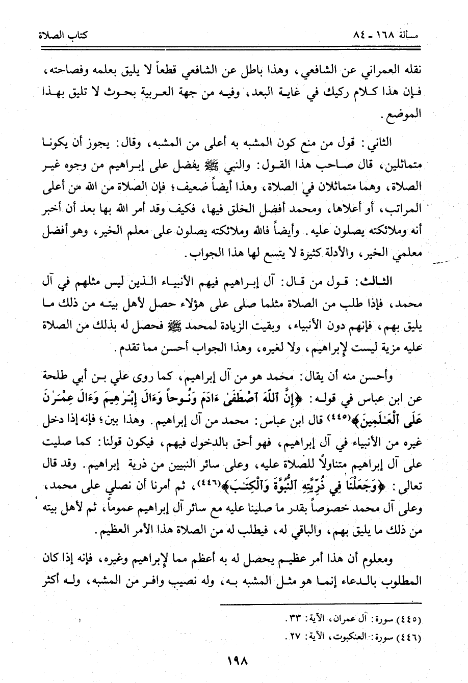 الثَّانِي: قَوْلُ مَنْ مَنَعَ كَوْنَ الْمُشَبَّهِ بِهِ أَعْلَى مِنْ الْمُشَبَّهِ، وَقَالَ: يَجُوزُ أَنْ يَكُونَا مُتَمَاثِلَيْنِ، قَالَ صَاحِبُ هَذَا الْقَوْلِ: وَالنَّبِيُّ - صَلَّى اللَّهُ عَلَيْهِ وَسَلَّمَ - يَفْضُلُ عَلَى إبْرَاهِيمَ مِنْ وُجُوهٍ غَيْرِ الصَّلَاةِ، وَهُمَا مُتَمَاثِلَانِ فِي الصَّلَاةِ، وَهَذَا أَيْضًا ضَعِيفٌ؛ فَإِنَّ الصَّلَاةَ مِنْ اللَّهِ مِنْ أَعْلَى الْمَرَاتِبِ، أَوْ أَعْلَاهَا، وَمُحَمَّدٌ أَفْضَلُ الْخَلْقِ فِيهَا، فَكَيْفَ وَقَدْ أَمَرَ اللَّهُ بِهَا بَعْدَ أَنْ أَخْبَرَ أَنَّهُ وَمَلَائِكَتَهُ يُصَلُّونَ عَلَيْهِ. وَأَيْضًا فَاَللَّهُ وَمَلَائِكَتُهُ يُصَلُّونَ عَلَى مُعَلِّمِ الْخَيْرِ، وَهُوَ أَفْضَلُ مُعَلِّمِي الْخَيْرِ، وَالْأَدِلَّةُ كَثِيرَةٌ لَا يَتَّسِعُ لَهَا هَذَا الْجَوَابُ.