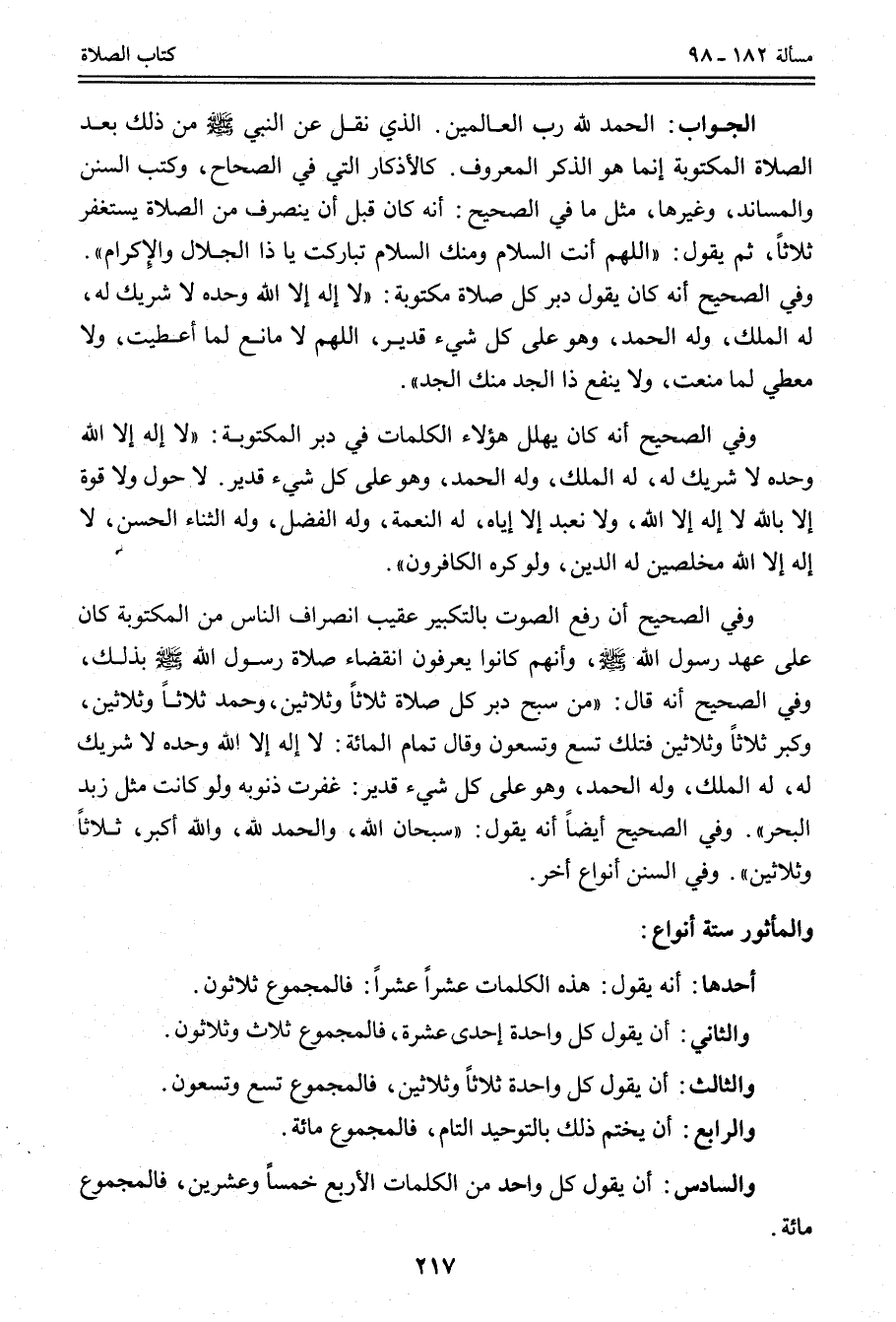 الْجَوَابُ: الْحَمْدُ لِلَّهِ رَبِّ الْعَالَمِينَ. الَّذِي نُقِلَ عَنْ النَّبِيِّ - صَلَّى اللَّهُ عَلَيْهِ وَسَلَّمَ - مِنْ ذَلِكَ بَعْدَ الصَّلَاةِ الْمَكْتُوبَةِ إنَّمَا هُوَ الذِّكْرُ الْمَعْرُوفُ. كَالْأَذْكَارِ الَّتِي فِي الصِّحَاحِ، وَكُتُبِ السُّنَنِ وَالْمَسَانِدِ، وَغَيْرِهَا، مِثْلَ مَا فِي الصَّحِيحِ: «أَنَّهُ كَانَ قَبْلَ أَنْ يَنْصَرِفَ مِنْ الصَّلَاةِ يَسْتَغْفِرُ ثَلَاثًا، ثُمَّ يَقُولُ: اللَّهُمَّ أَنْتَ السَّلَامُ وَمِنْك السَّلَامُ تَبَارَكْت يَا ذَا الْجَلَالِ وَالْإِكْرَامِ» .