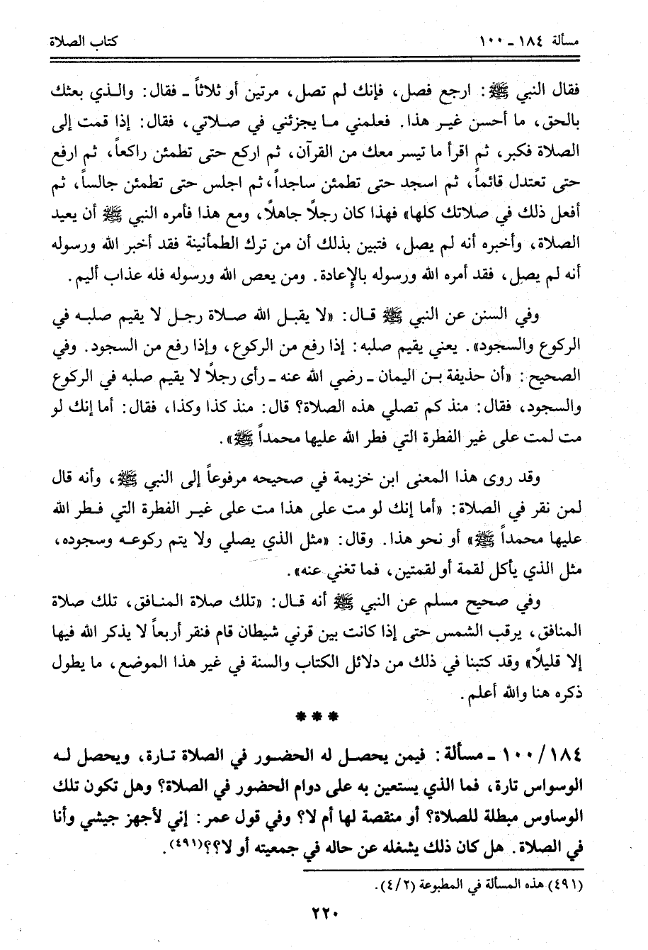 184 - 100 مَسْأَلَةٌ: فِيمَنْ يَحْصُلُ لَهُ الْحُضُورُ فِي الصَّلَاةِ تَارَةً، وَيَحْصُلُ لَهُ الْوَسْوَاسُ تَارَةً، فَمَا الَّذِي يَسْتَعِينُ بِهِ عَلَى دَوَامِ الْحُضُورِ فِي الصَّلَاةِ؟ وَهَلْ تَكُونُ تِلْكَ الْوَسَاوِسُ مُبْطِلَةً لِلصَّلَاةِ؟ أَوْ مُنْقِصَةً لَهَا أَمْ لَا؟ وَفِي قَوْلِ عُمَرَ: إنِّي لَأُجَهِّزُ جَيْشِي وَأَنَا فِي الصَّلَاةِ. هَلْ كَانَ ذَلِكَ يَشْغَلُهُ عَنْ حَالِهِ فِي جَمْعِيَّتِهِ أَوْ لَا؟