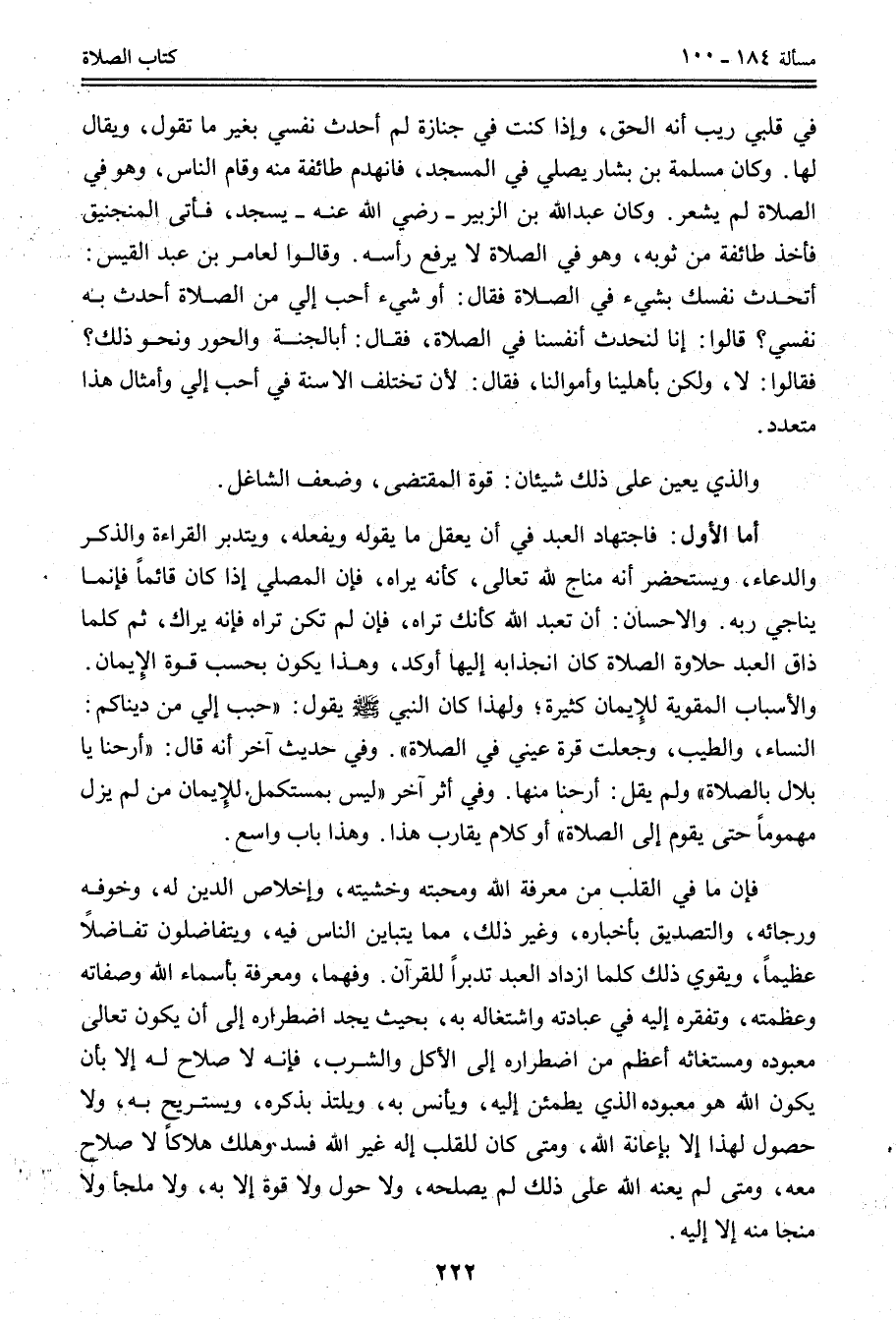 فِي قَلْبِي رَيْبٌ أَنَّهُ الْحَقُّ، وَإِذَا كُنْت فِي جِنَازَةٍ لَمْ أُحَدِّثْ نَفْسِي بِغَيْرِ مَا تَقُولُ، وَيُقَالُ لَهَا. وَكَانَ مَسْلَمَةُ بْنُ بَشَّارٍ يُصَلِّي فِي الْمَسْجِدِ، فَانْهَدَمَ طَائِفَةٌ مِنْهُ وَقَامَ النَّاسُ، وَهُوَ فِي الصَّلَاةِ لَمْ يَشْعُرْ. وَكَانَ عَبْدُ اللَّهِ بْنُ الزُّبَيْرِ - رَضِيَ اللَّهُ عَنْهُ - يَسْجُدُ، فَأَتَى الْمَنْجَنِيقُ فَأَخَذَ طَائِفَةً مِنْ ثَوْبِهِ، وَهُوَ فِي الصَّلَاةِ لَا يَرْفَعُ رَأْسَهُ. وَقَالُوا لِعَامِرِ بْنِ عَبْدِ الْقَيْسِ: أَتُحَدِّثُ نَفْسَك بِشَيْءٍ فِي الصَّلَاةِ فَقَالَ: أَوَ شَيْءٌ أَحَبُّ إلَيَّ مِنْ الصَّلَاةِ أُحَدِّثُ بِهِ نَفْسِي؟ قَالُوا: إنَّا لَنُحَدِّثُ أَنْفُسَنَا فِي الصَّلَاةِ، فَقَالَ: أَبِالْجَنَّةِ وَالْحُورِ وَنَحْوِ ذَلِكَ؟ فَقَالُوا: لَا، وَلَكِنْ بِأَهْلِينَا وَأَمْوَالِنَا، فَقَالَ: لَأَنْ تَخْتَلِفَ الْأَسِنَّةُ فِي أَحَبُّ إلَيَّ وَأَمْثَالُ هَذَا مُتَعَدِّدٌ.
