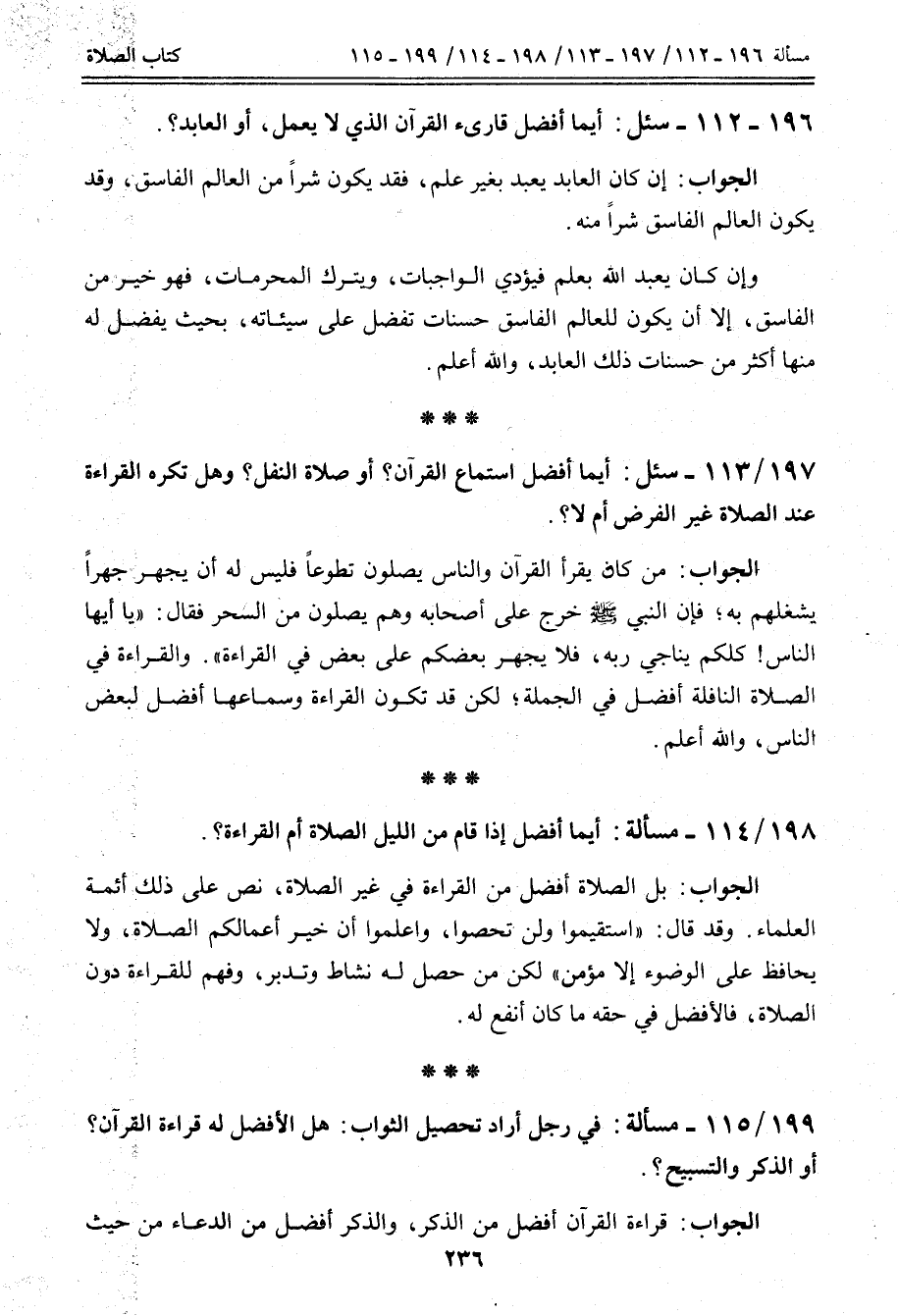 197 - 113 سُئِلَ: أَيُّمَا أَفْضَلُ اسْتِمَاعُ الْقُرْآنِ؟ أَوْ صَلَاةُ النَّفْلِ؟ وَهَلْ تُكْرَهُ الْقِرَاءَةُ عِنْدَ الصَّلَاةِ غَيْرَ الْفَرْضِ أَمْ لَا؟