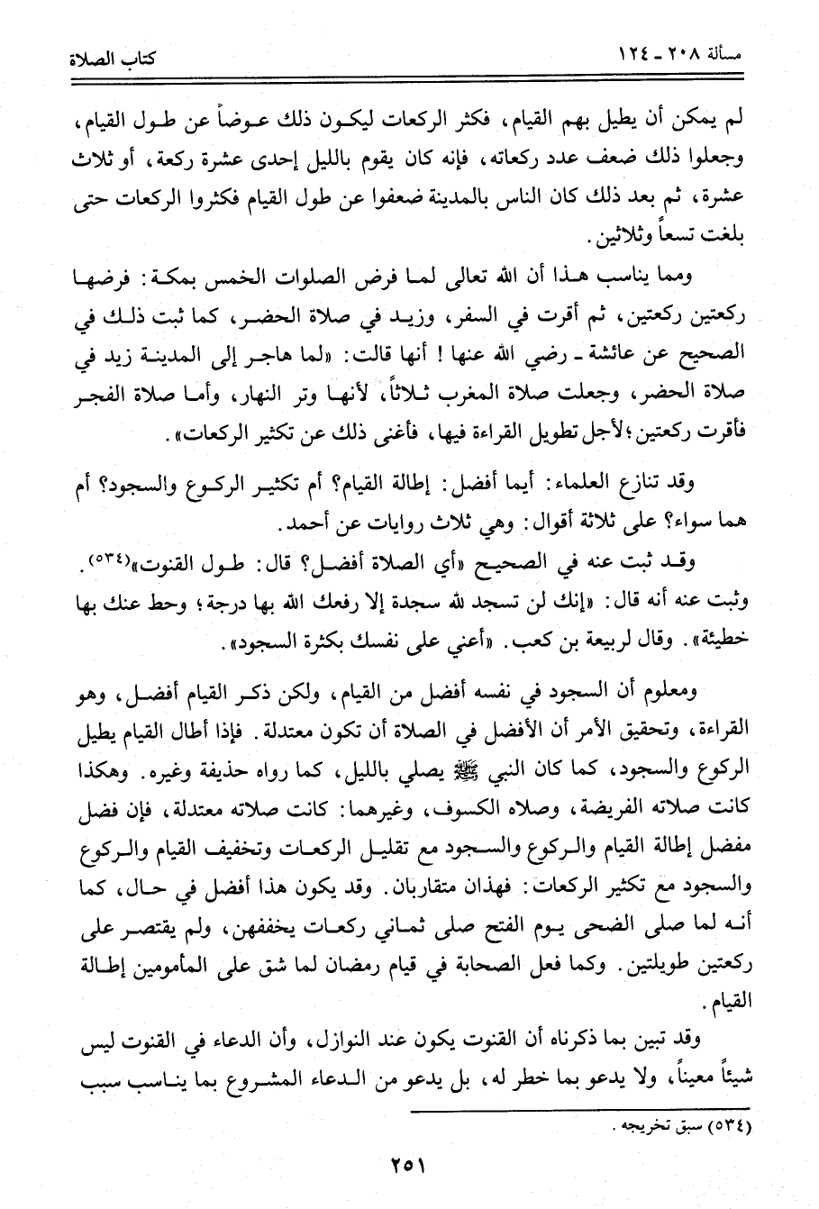 وَمَعْلُومٌ أَنَّ السُّجُودَ فِي نَفْسِهِ أَفْضَلُ مِنْ الْقِيَامِ، وَلَكِنَّ ذِكْرَ الْقِيَامِ أَفْضَلُ، وَهُوَ الْقِرَاءَةُ، وَتَحْقِيقُ الْأَمْرِ أَنَّ الْأَفْضَلَ فِي الصَّلَاةِ أَنْ تَكُونَ مُعْتَدِلَةً. فَإِذَا أَطَالَ الْقِيَامَ يُطِيلُ الرُّكُوعَ وَالسُّجُودَ، كَمَا كَانَ النَّبِيُّ - صَلَّى اللَّهُ عَلَيْهِ وَسَلَّمَ - يُصَلِّي بِاللَّيْلِ، كَمَا رَوَاهُ حُذَيْفَةُ وَغَيْرُهُ. وَهَكَذَا كَانَتْ صَلَاتُهُ الْفَرِيضَةَ، وَصَلَاةُ الْكُسُوفِ، وَغَيْرُهُمَا: كَانَتْ صَلَاتُهُ مُعْتَدِلَةً، فَإِنْ فَضَّلَ مُفَضِّلٌ إطَالَةَ الْقِيَامِ وَالرُّكُوعِ وَالسُّجُودِ مَعَ تَقْلِيلِ الرَّكَعَاتِ وَتَخْفِيفِ الْقِيَامِ وَالرُّكُوعِ وَالسُّجُودِ مَعَ تَكْثِيرِ الرَّكَعَاتِ: فَهَذَانِ مُتَقَارِبَانِ. وَقَدْ يَكُونُ هَذَا أَفْضَلَ فِي حَالٍ، كَمَا أَنَّهُ لَمَّا صَلَّى الضُّحَى يَوْمَ الْفَتْحِ صَلَّى ثَمَانِيَ رَكَعَاتٍ يُخَفِّفُهُنَّ، وَلَمْ يَقْتَصِرْ عَلَى رَكْعَتَيْنِ طَوِيلَتَيْنِ. وَكَمَا فَعَلَ الصَّحَابَةُ فِي قِيَامِ رَمَضَانَ لَمَّا شَقَّ عَلَى الْمَأْمُومِينَ إطَالَةُ الْقِيَامِ.