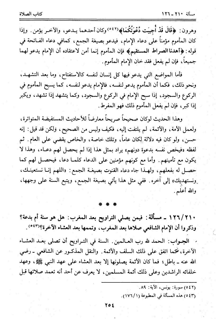 وَهَارُونَ: {قَالَ قَدْ أُجِيبَتْ دَعْوَتُكُمَا} [يونس: 89] وَكَانَ أَحَدُهُمَا يَدْعُو، وَالْآخَرُ يُؤَمِّنُ. وَإِذَا كَانَ الْمَأْمُومُ مُؤَمِّنًا عَلَى دُعَاءِ الْإِمَامِ، فَيَدْعُو بِصِيغَةِ الْجَمْعِ، كَمَا فِي دُعَاءِ الْفَاتِحَةِ فِي قَوْلِهِ: {اهْدِنَا الصِّرَاطَ الْمُسْتَقِيمَ} [الفاتحة: 6] فَإِنَّ الْمَأْمُومَ إنَّمَا أَمَّنَ لِاعْتِقَادِهِ أَنَّ الْإِمَامَ يَدْعُو لَهُمَا جَمِيعًا، فَإِنْ لَمْ يَفْعَلْ فَقَدْ خَانَ الْإِمَامُ الْمَأْمُومَ.