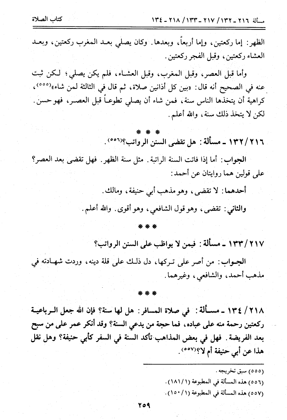 218 - 134 - مَسْأَلَةٌ: فِي صَلَاةِ الْمُسَافِرِ: هَلْ لَهَا سُنَّةٌ؟ فَإِنَّ اللَّهَ جَعَلَ الرُّبَاعِيَّةَ رَكْعَتَيْنِ رَحْمَةً مِنْهُ عَلَى عِبَادِهِ، فَمَا حُجَّةُ مَنْ يَدَّعِي السُّنَّةَ؟ وَقَدْ أَنْكَرَ عُمَرُ عَلَى مَنْ سَبَّحَ بَعْدَ الْفَرِيضَةِ.