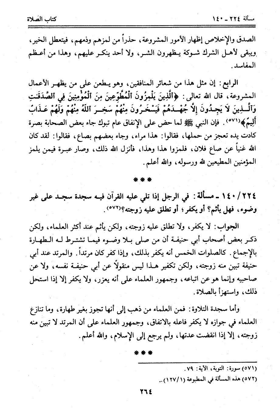 224 - 140 - مَسْأَلَةٌ: فِي الرَّجُلِ إذَا تُلِيَ عَلَيْهِ الْقُرْآنُ فِيهِ سَجْدَةٌ سَجَدَ عَلَى غَيْرِ وُضُوءٍ، فَهَلْ يَأْثَمُ؟ أَوْ يَكْفُرُ؛ أَوْ تَطْلُقُ عَلَيْهِ زَوْجَتُهُ؟