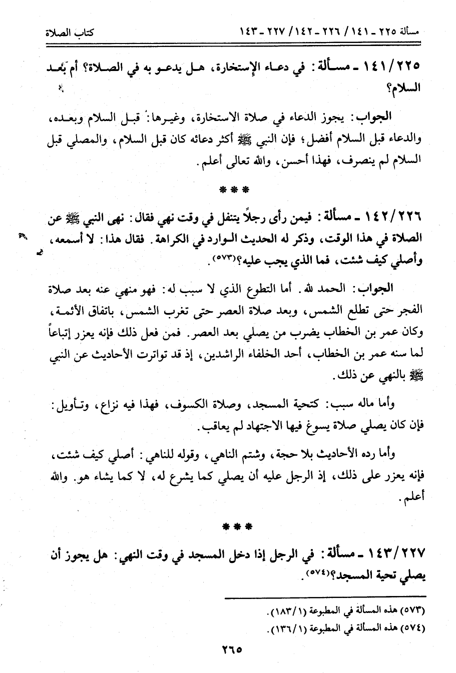 227 - 143 - مَسْأَلَةٌ: فِي الرَّجُلِ إذَا دَخَلَ الْمَسْجِدَ فِي وَقْتِ النَّهْيِ: هَلْ يَجُوزُ أَنْ يُصَلِّيَ تَحِيَّةَ الْمَسْجِدِ؟ .