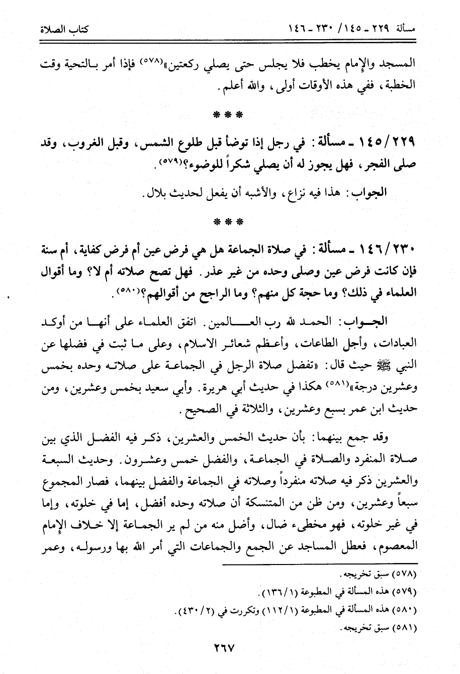 الْجَوَابُ: الْحَمْدُ لِلَّهِ رَبِّ الْعَالَمِينَ اتَّفَقَ الْعُلَمَاءُ عَلَى أَنَّهَا مِنْ أَوْكَدِ الْعِبَادَاتِ، وَأَجَلِّ الطَّاعَاتِ، وَأَعْظَمِ شَعَائِرِ الْإِسْلَامِ، وَعَلَى مَا ثَبَتَ مِنْ فَضْلِهَا عَنْ النَّبِيِّ - صَلَّى اللَّهُ عَلَيْهِ وَسَلَّمَ - حَيْثُ قَالَ: «تَفْضُلُ صَلَاةُ الرَّجُلِ فِي الْجَمَاعَةِ عَلَى صَلَاتِهِ وَحْدَهُ بِخَمْسٍ وَعِشْرِينَ دَرَجَةً» هَكَذَا فِي حَدِيثِ أَبِي هُرَيْرَةَ وَأَبِي سَعِيدٍ بِخَمْسٍ وَعِشْرِينَ، وَمِنْ حَدِيثِ ابْنِ عُمَرَ بِسَبْعٍ وَعِشْرِينَ، وَالثَّلَاثَةُ فِي الصَّحِيحِ.