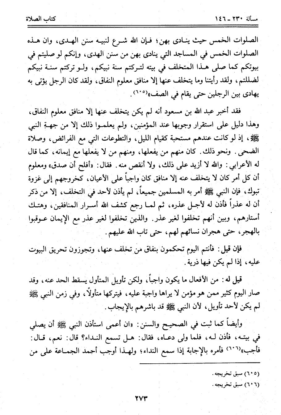 الصَّلَوَاتِ الْخَمْسَ حَيْثُ يُنَادَى بِهِنَّ؛ فَإِنَّ اللَّهَ شَرَعَ لِنَبِيِّهِ سُنَنَ الْهُدَى، وَإِنَّ هَذِهِ الصَّلَوَاتِ الْخَمْسَ فِي الْمَسَاجِدِ الَّتِي يُنَادَى بِهِنَّ مِنْ سُنَنِ الْهُدَى، وَإِنَّكُمْ لَوْ صَلَّيْتُمْ فِي بُيُوتِكُمْ كَمَا صَلَّى هَذَا الْمُتَخَلِّفُ فِي بَيْتِهِ لَتَرَكْتُمْ سُنَّةَ نَبِيِّكُمْ، وَلَوْ تَرَكْتُمْ سُنَّةَ نَبِيِّكُمْ لَضَلَلْتُمْ، وَلَقَدْ رَأَيْتُنَا وَمَا يَتَخَلَّفُ عَنْهَا إلَّا مُنَافِقٌ مَعْلُومُ النِّفَاقِ، وَلَقَدْ كَانَ الرَّجُلُ يُؤْتَى بِهِ يُهَادَى بَيْنَ الرَّجُلَيْنِ حَتَّى يُقَامَ فِي الصَّفِّ.